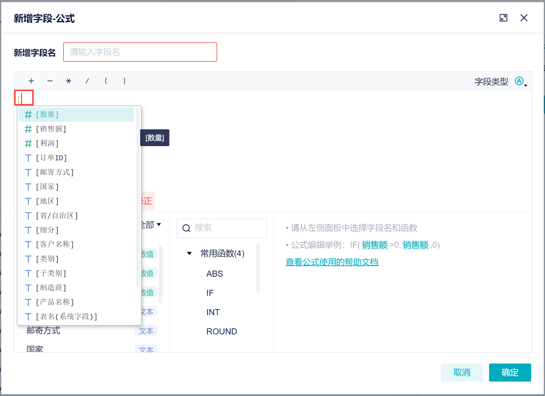 2)在编辑框中输入 [ ,在列表中会展示当前可以使用的字段,方便用户选择字段。如下图所示: