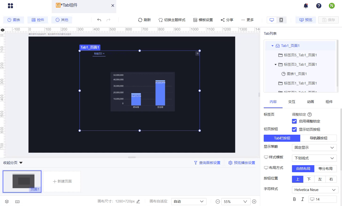 选中 Tab 整体,在 Tab 列表下方「属性」配置面板中,可对标签页和切页按钮进行设置。如下图所示: