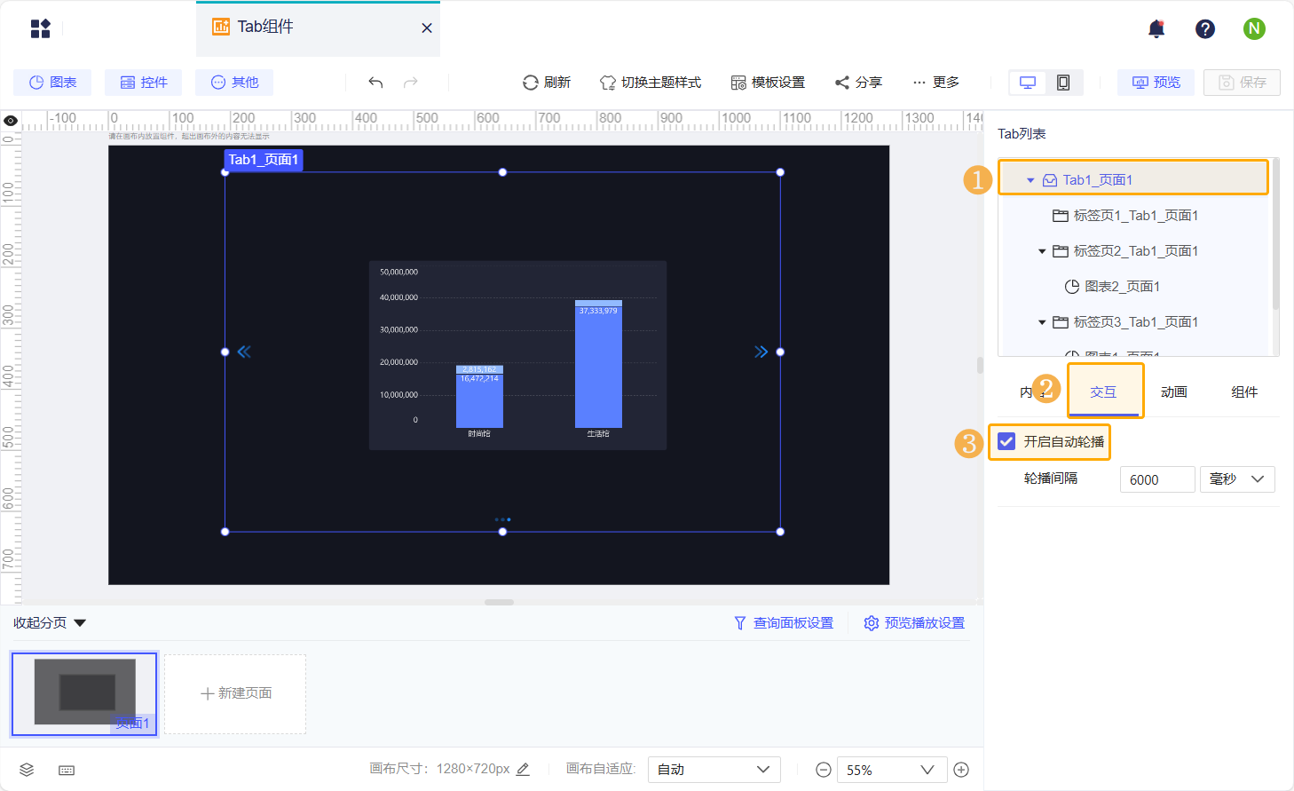 开启自动轮播时,可设置轮播间隔,默认为 6000 毫秒。Tab 组件按照 Tab列表中的顺序和轮播间隔时间,循环展示各标签页内容。