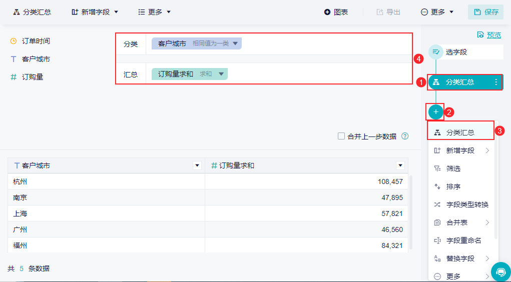4)新增一个分类汇总步骤,汇总每个城市的订购总量,如下图所示: