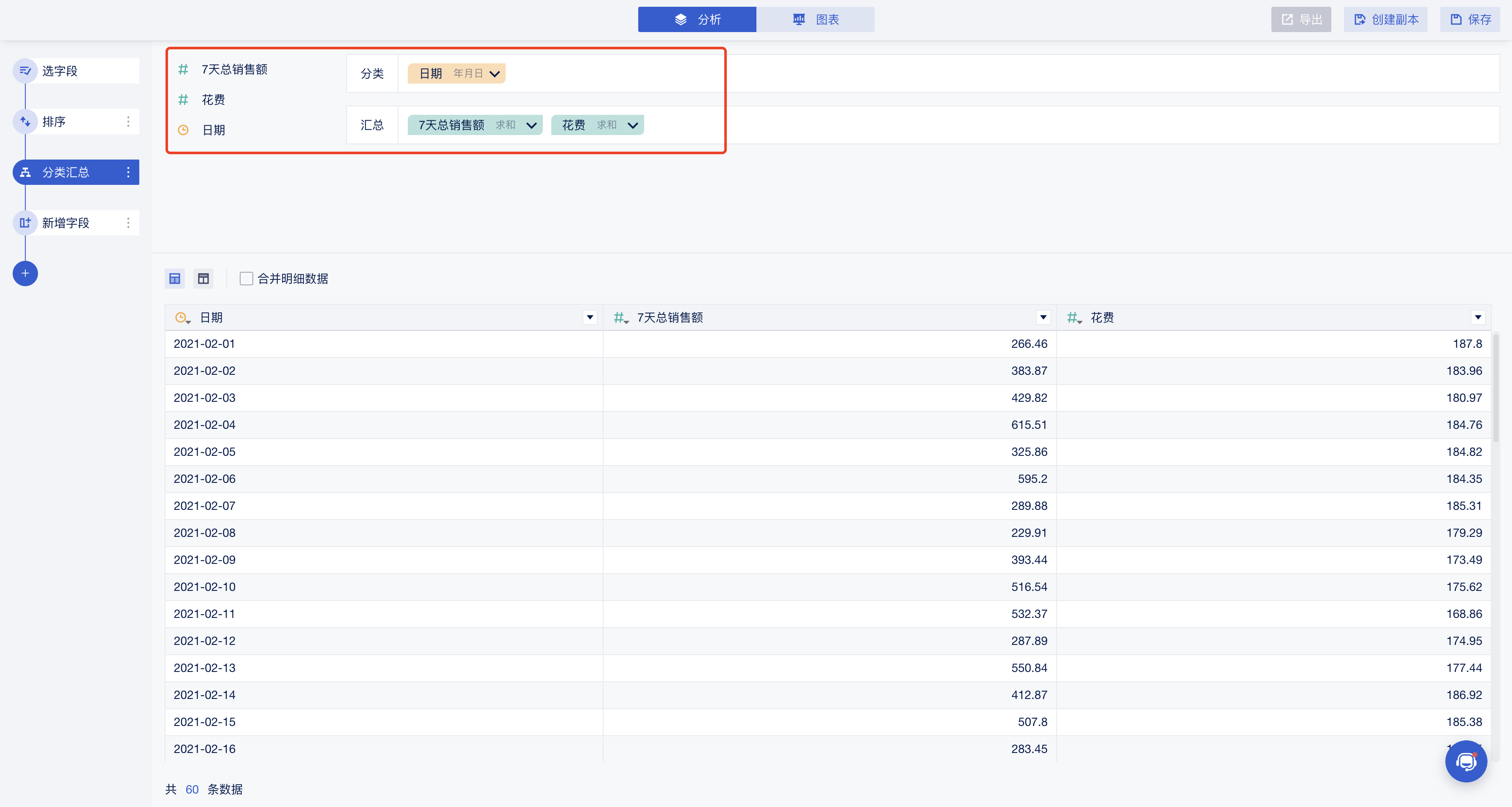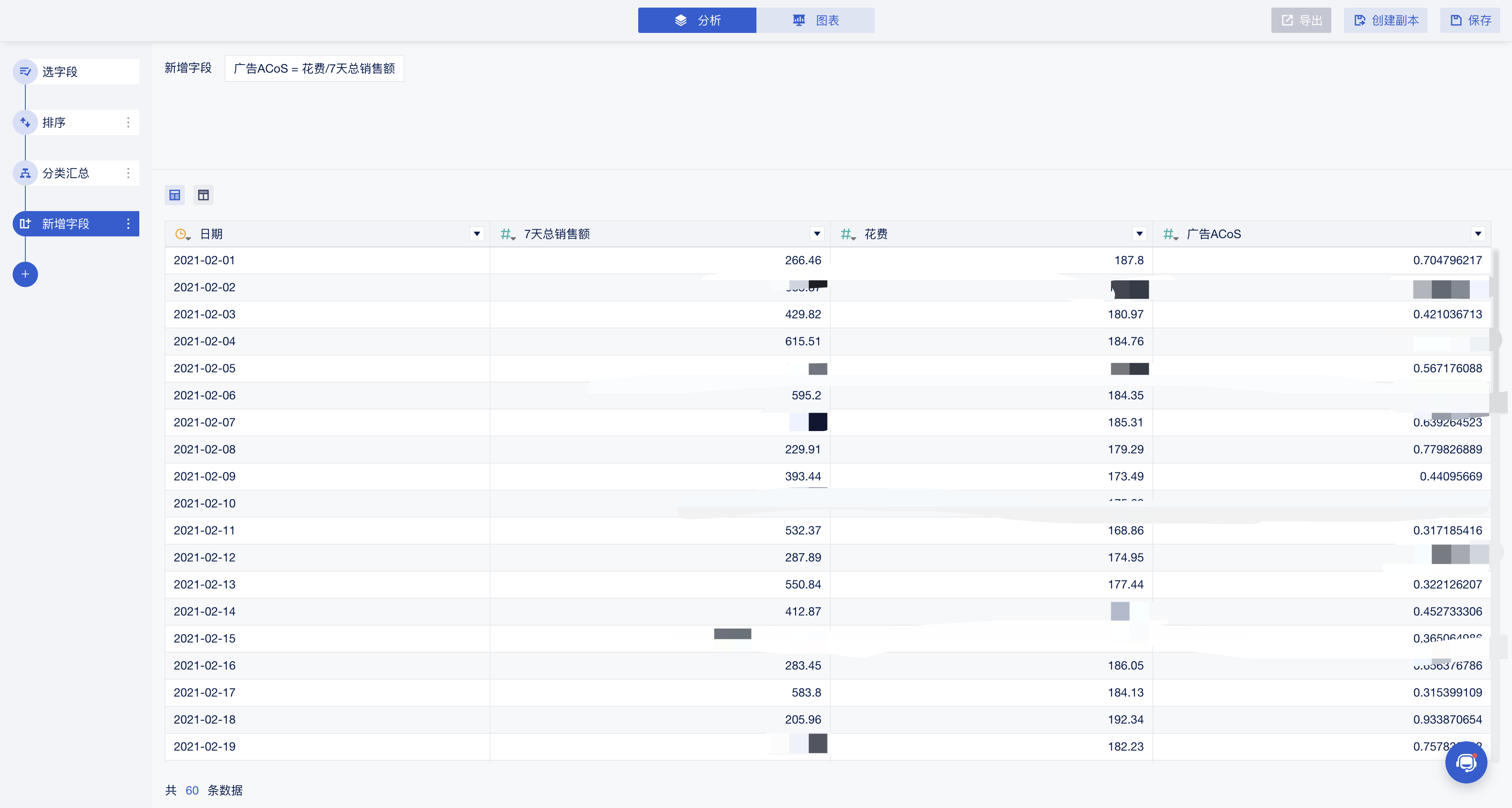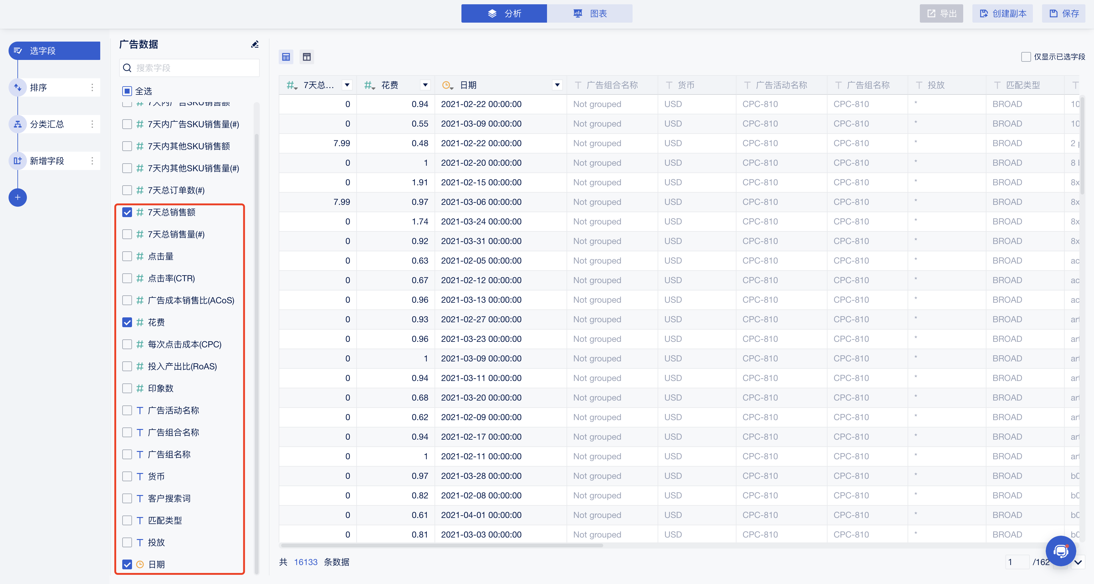 广告销售花费趋势分析有三项指标,销售额,花费,ACoS(广告成本销售比)。在这边我们用销售额/花费来代表ACoS,所以需要选取的字段即销售额,花费和日期。