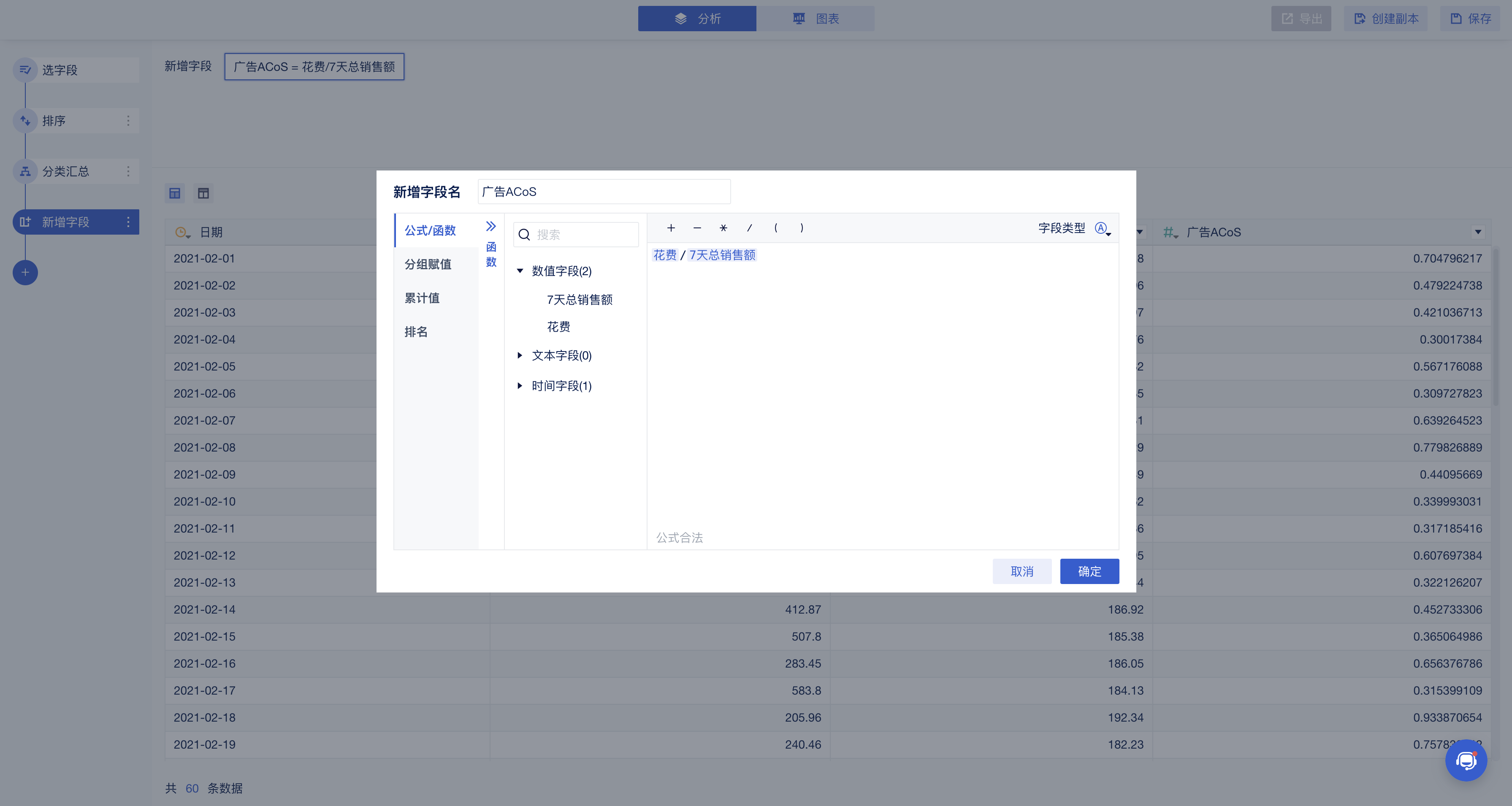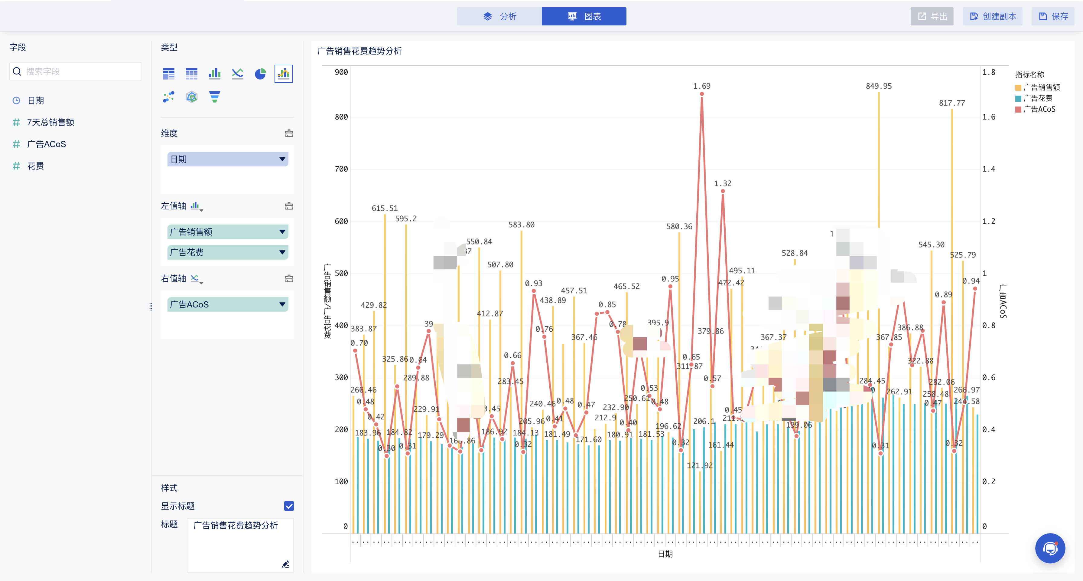 点击右侧的图表按钮添加图表,我们选取的表类型是组合图。包含了柱形图和折线图。以日期为维度,左值轴为广告销售额和广告花费,用柱形图显示;右值轴为ACoS,以折线图显示。保存以上分析表,可以直接点击表名进行重命名。