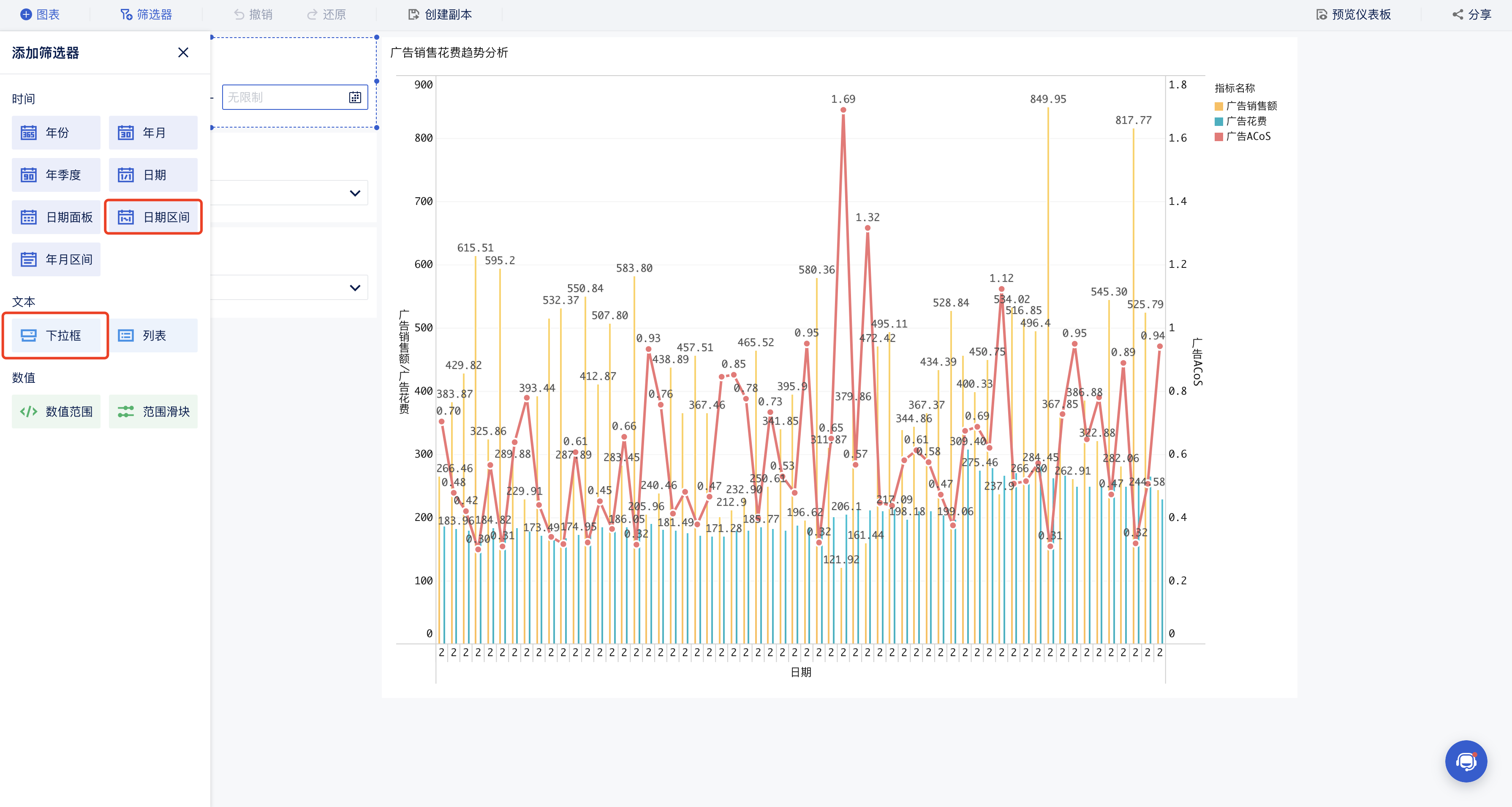 添加日期区间,绑定数据为广告销售花费趋势分析的日期。