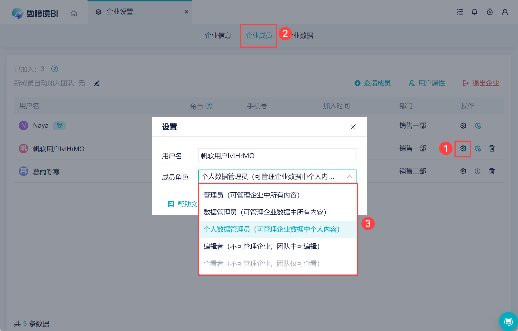 数跨境有五种成员角色:管理员、数据管理员、个人数据管理员、编辑者、查看者,可以根据自己企业的实际情况设置成员的角色。