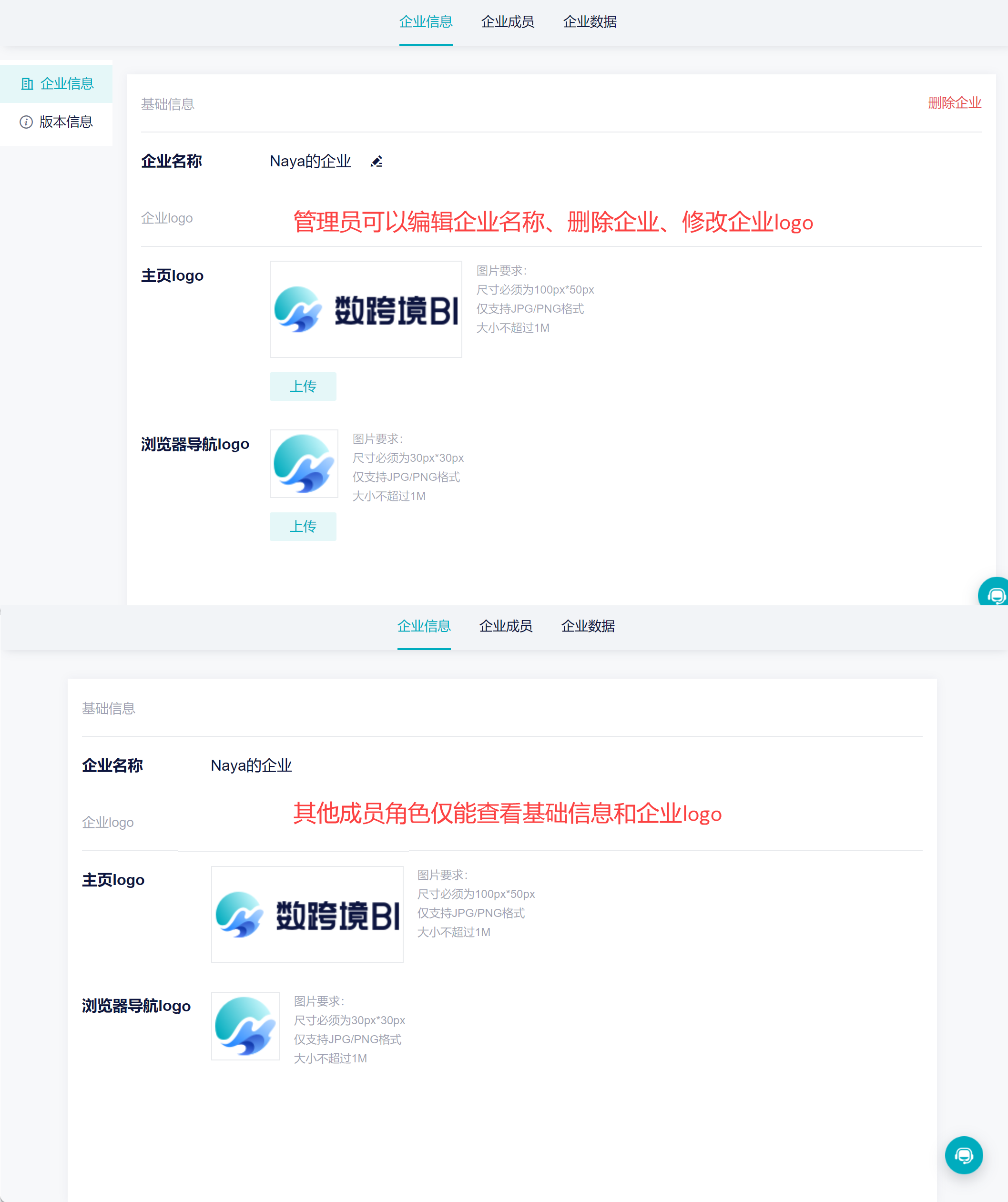 管理员可以编辑企业名称、删除企业、查看版本信息等操作,其他角色仅能查看企业名称。