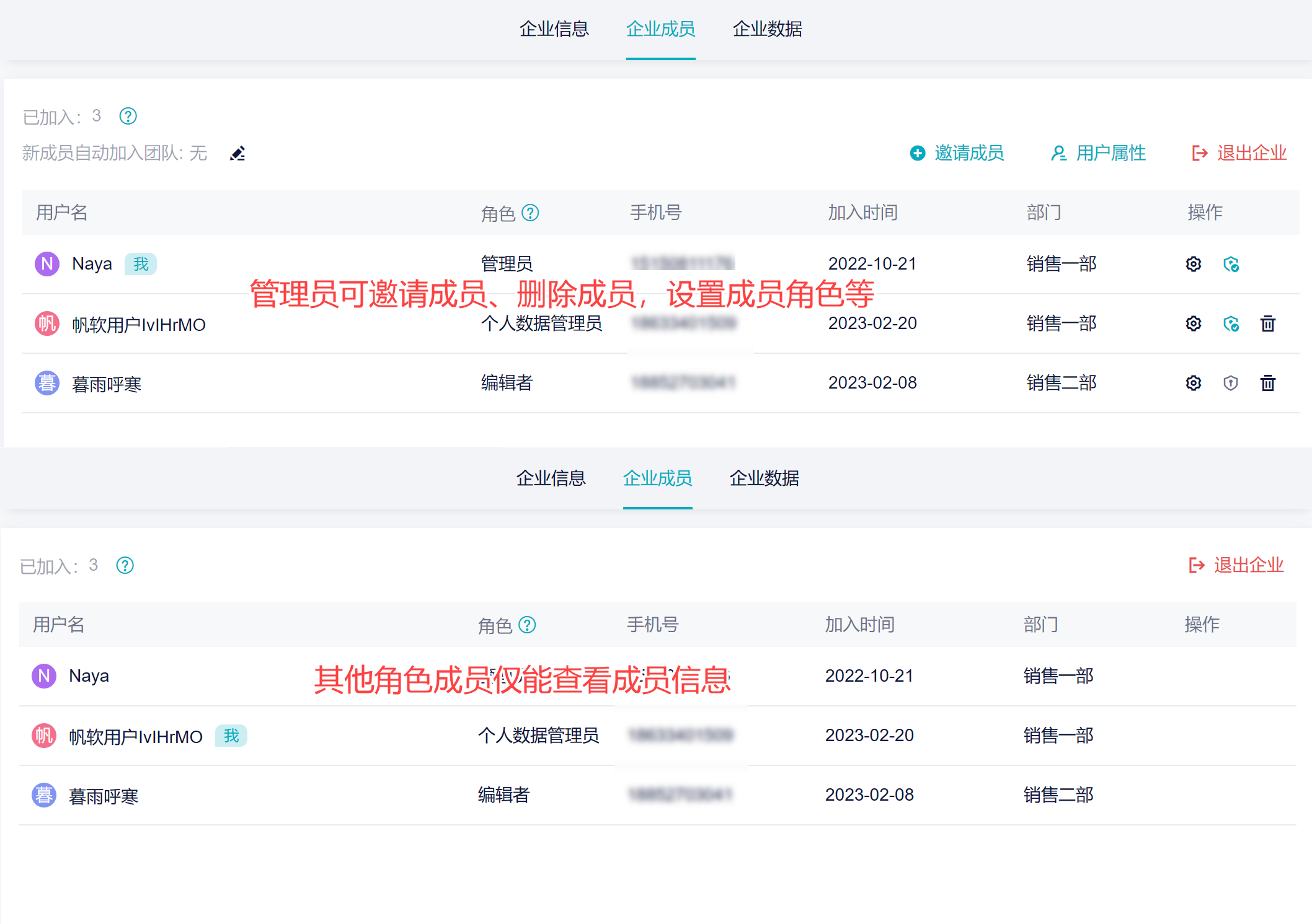 管理员拥有「企业成员」所有权限,其他角色仅能查看成员信息。