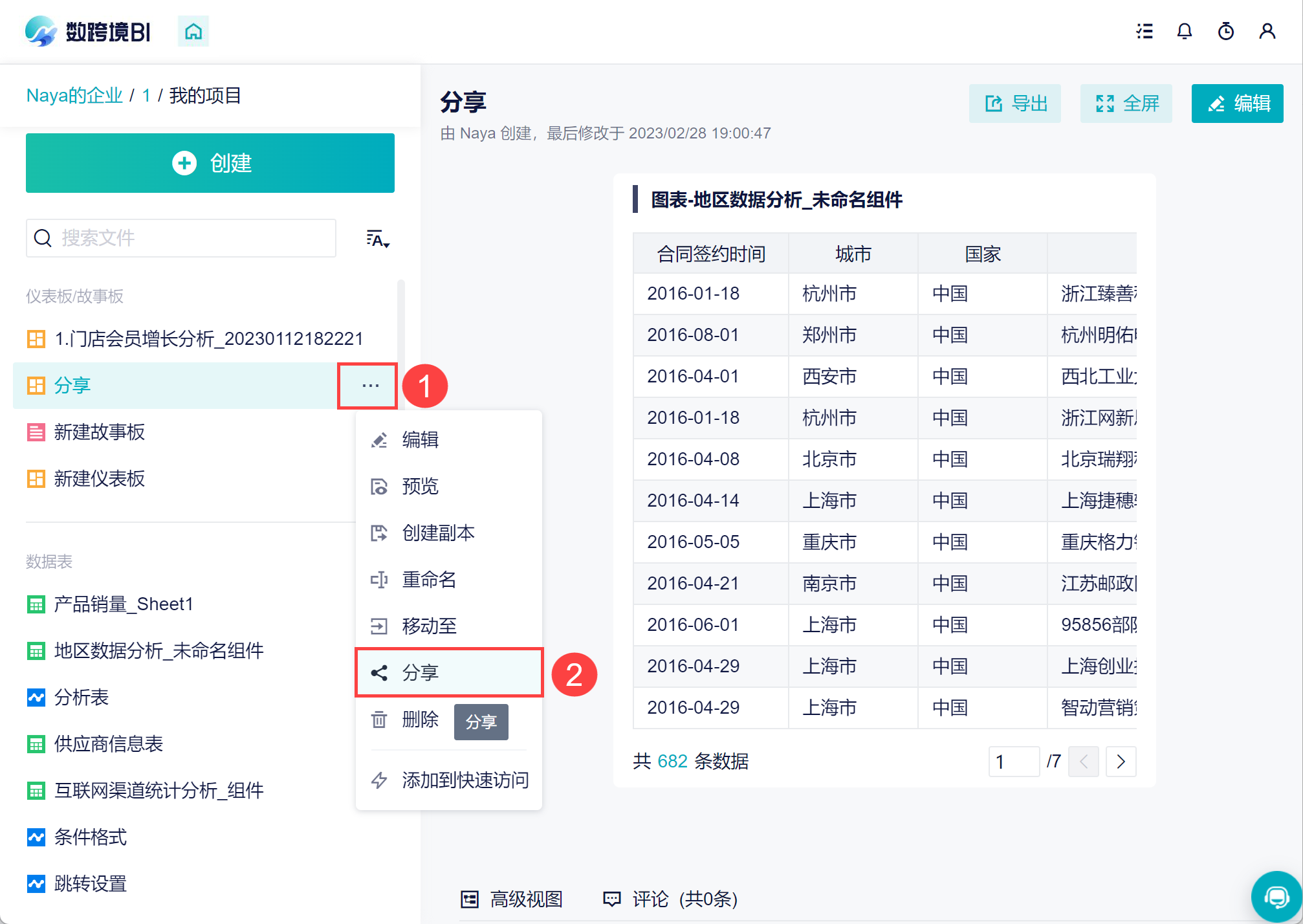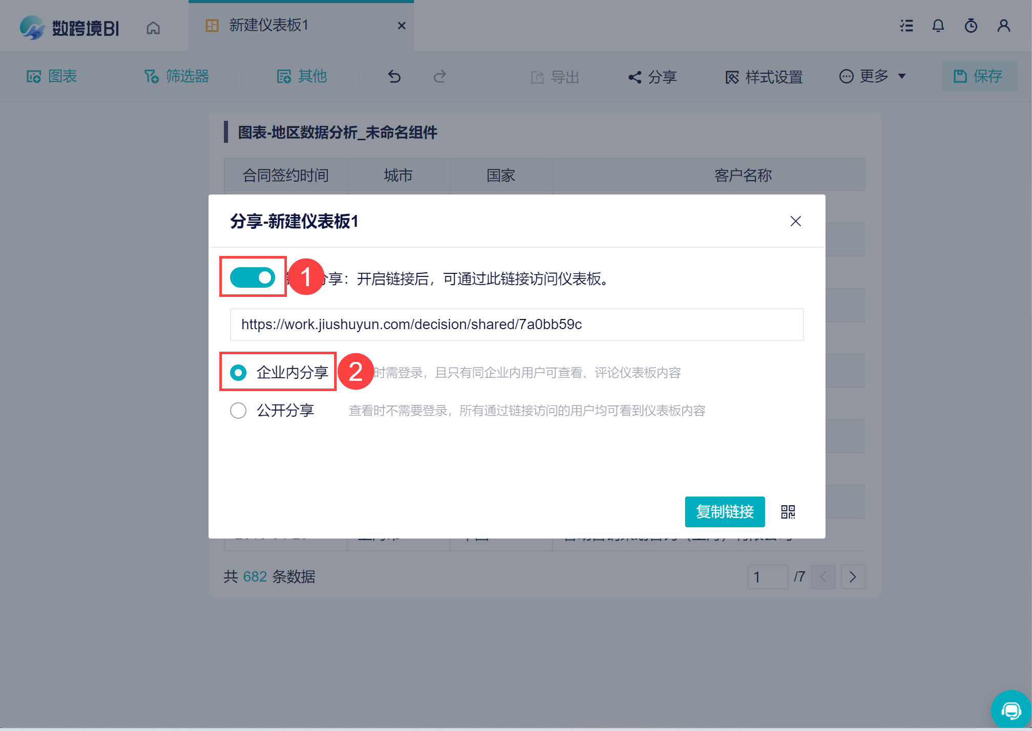 企业内分享:查看时需登录,且只有同企业内用户可查看、评论仪表板内容。