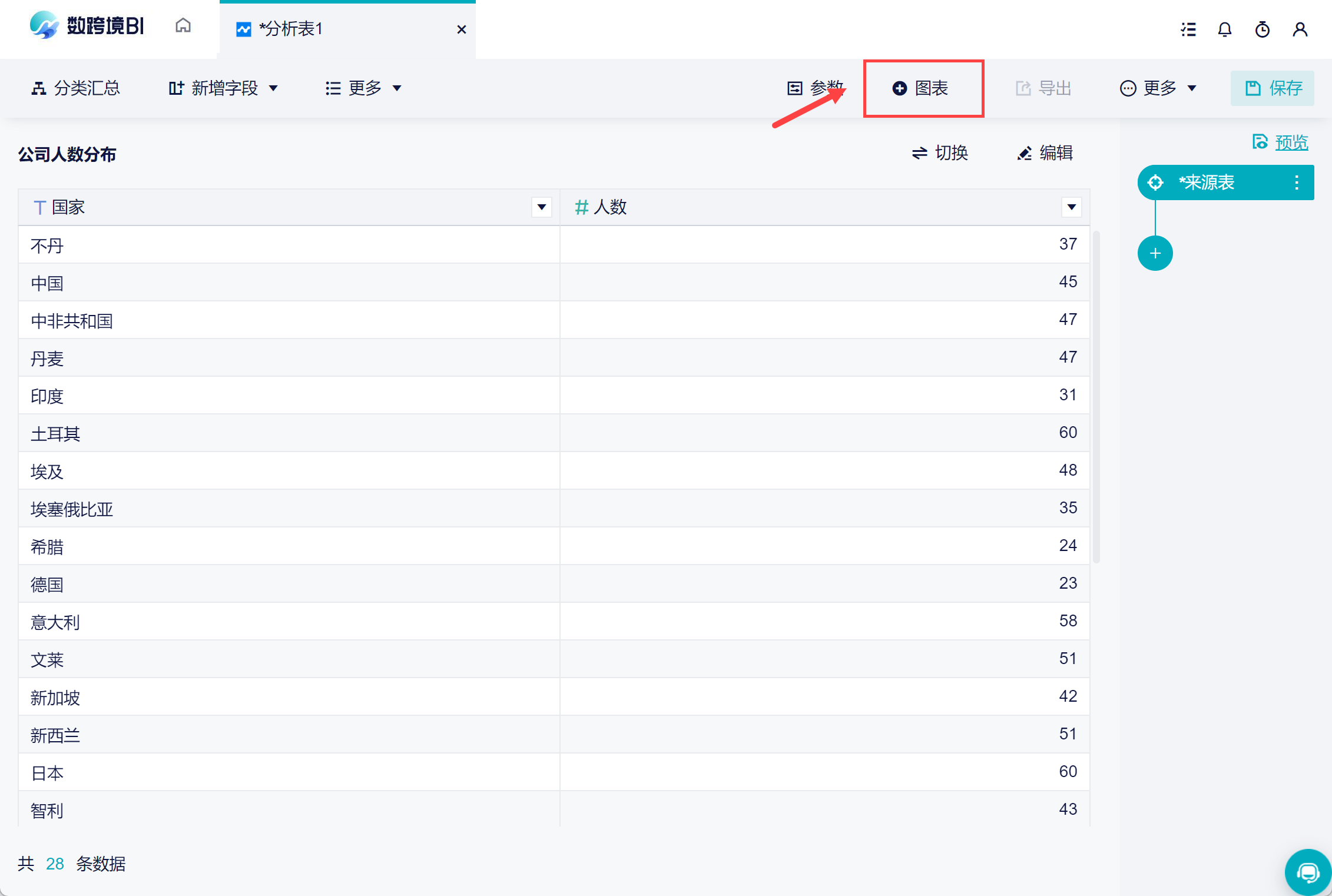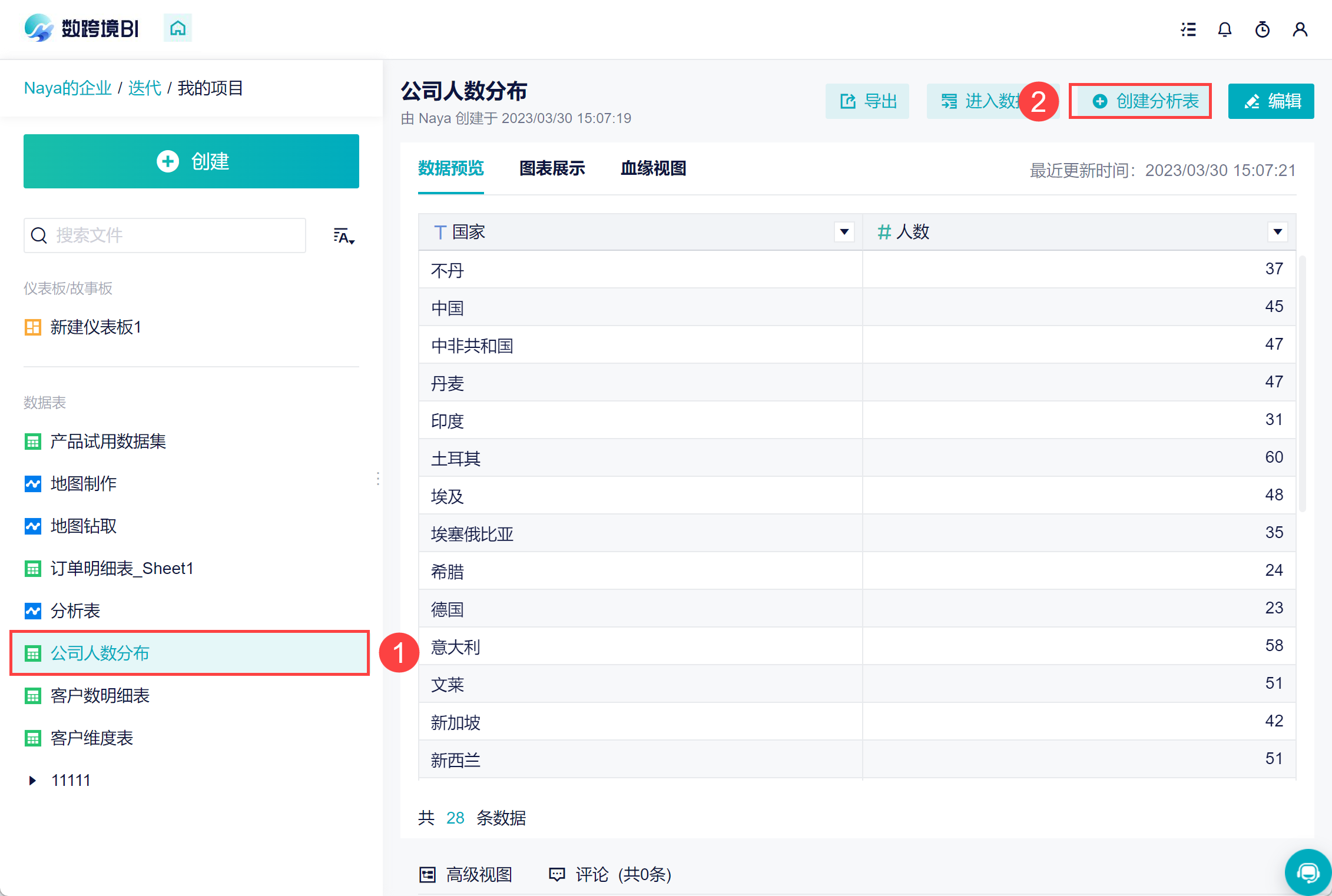 1)下载示例数据并 上传 至数跨境,将数据保存在项目中,使用「公司人数分布」创建分析表,如下图所示: