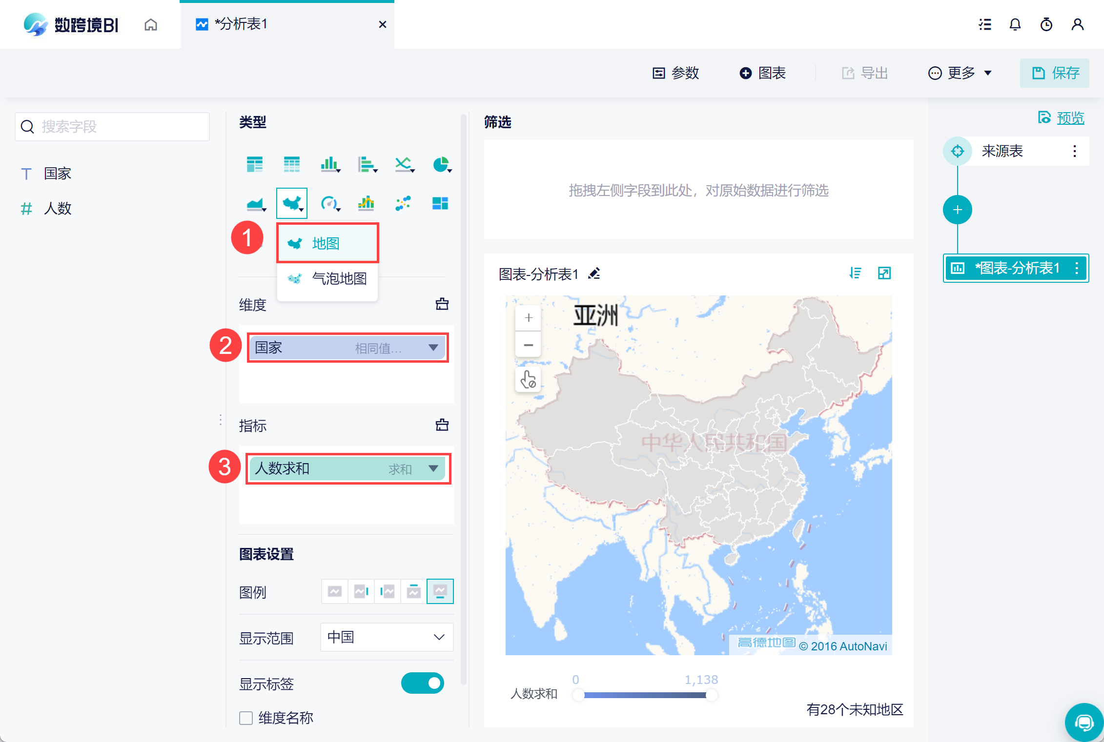 3)这里选择制作「地图」,将「国家」字段拖入维度栏,将「人数」字段拖入指标栏,如下图所示:
