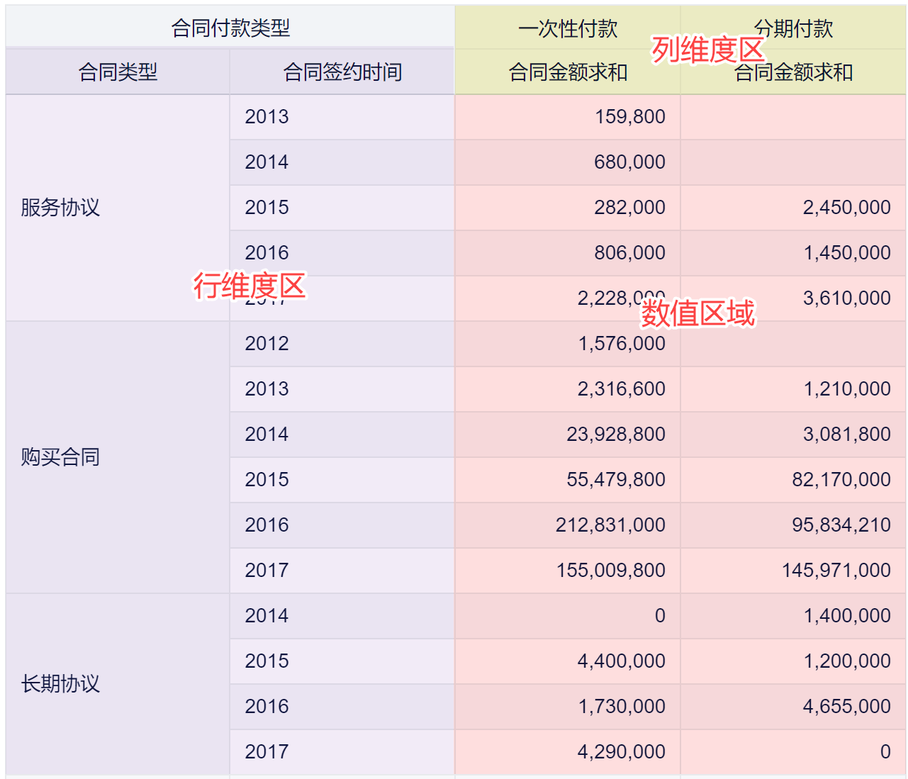用户多用来显示表中某个字段的汇总值,并将它们分组。其中一组为行维度-在数据表的左侧,另一组列维度-在数据表的上部。行和列的交叉处即「数值区域」可以对数据进行多种汇总计算,比如求和、平均值、记数、最大值、最小值等。