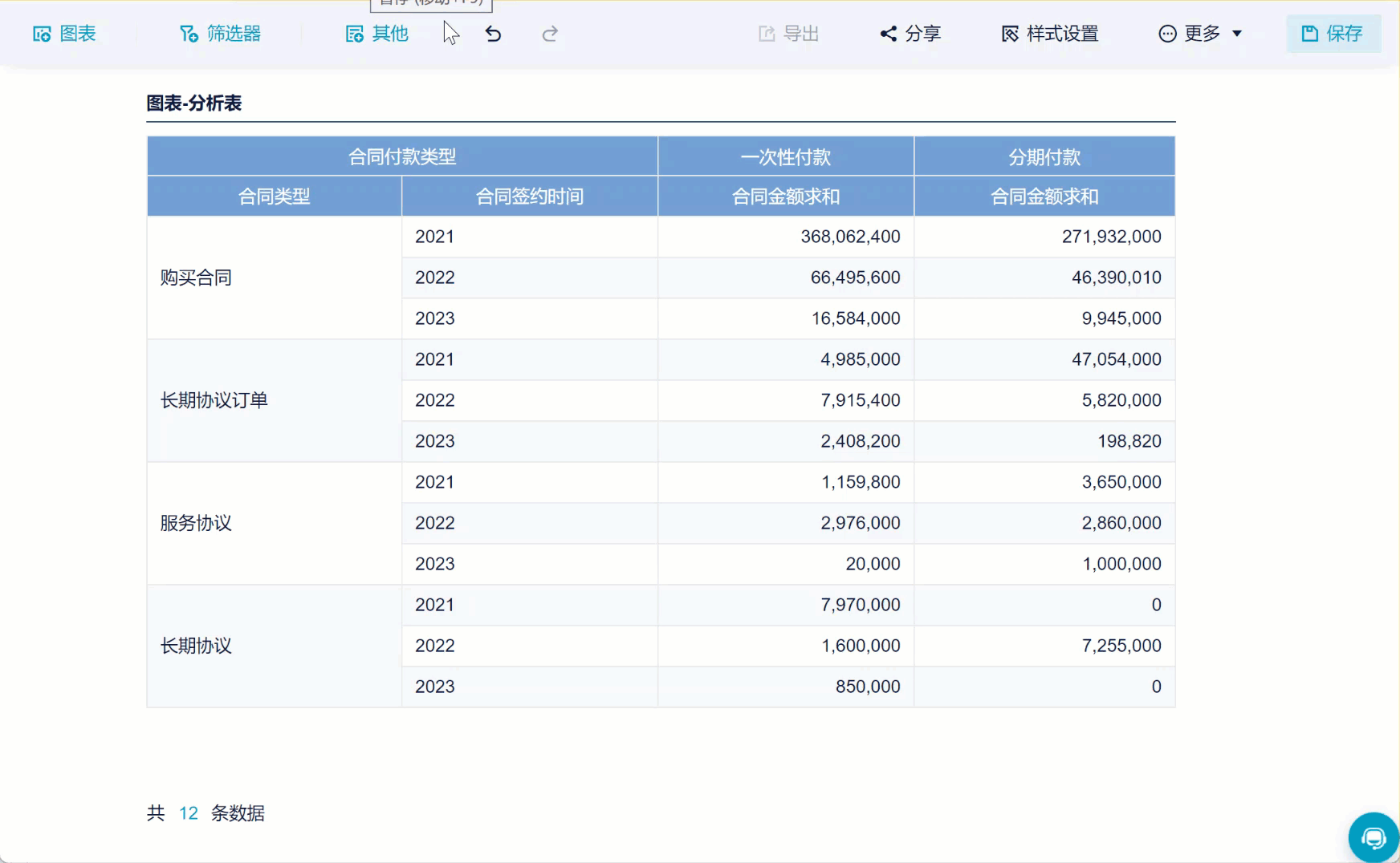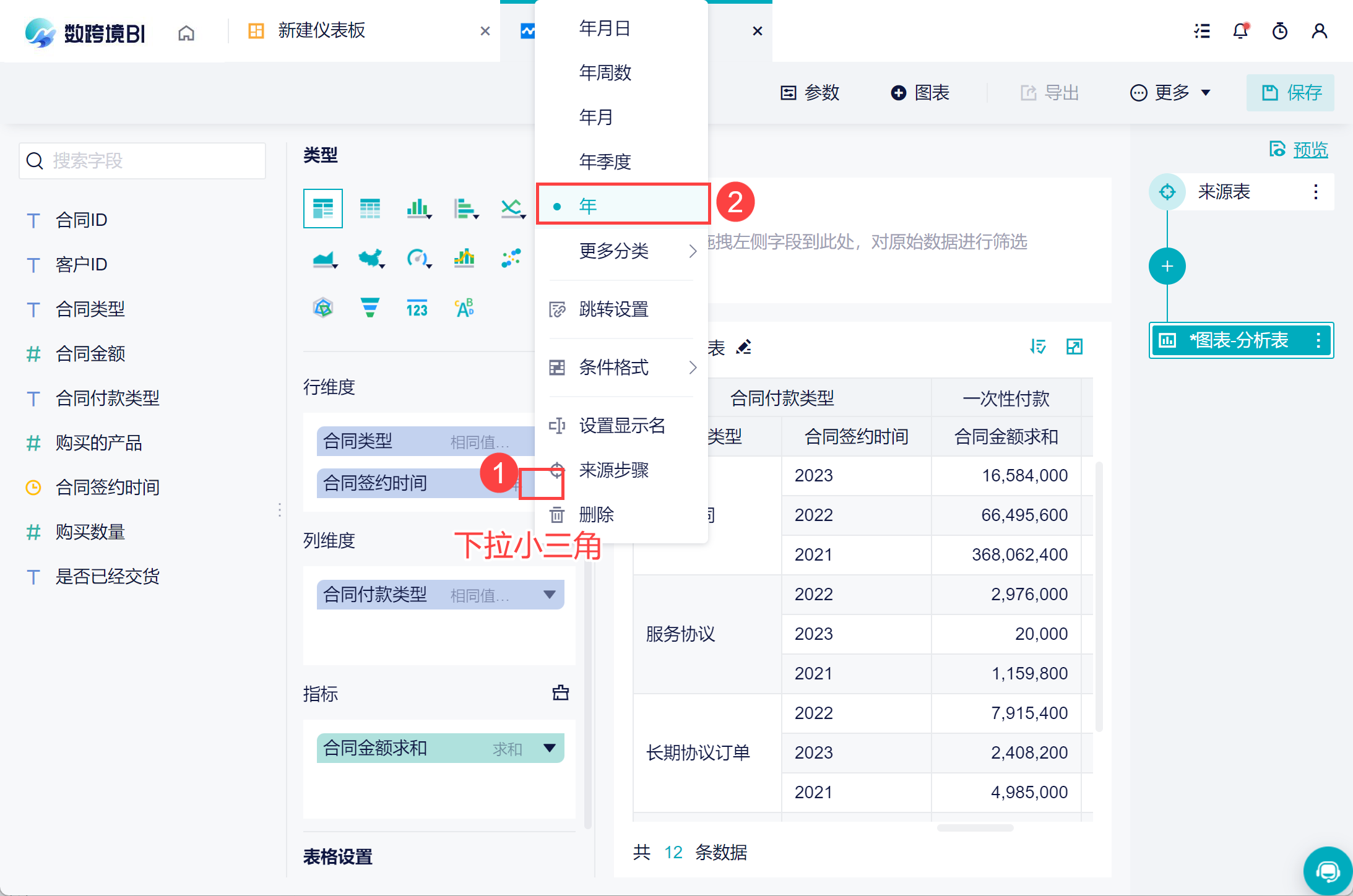 点击「合同签约时间」字段下拉框,选择按「年」分组显示,如下图所示: