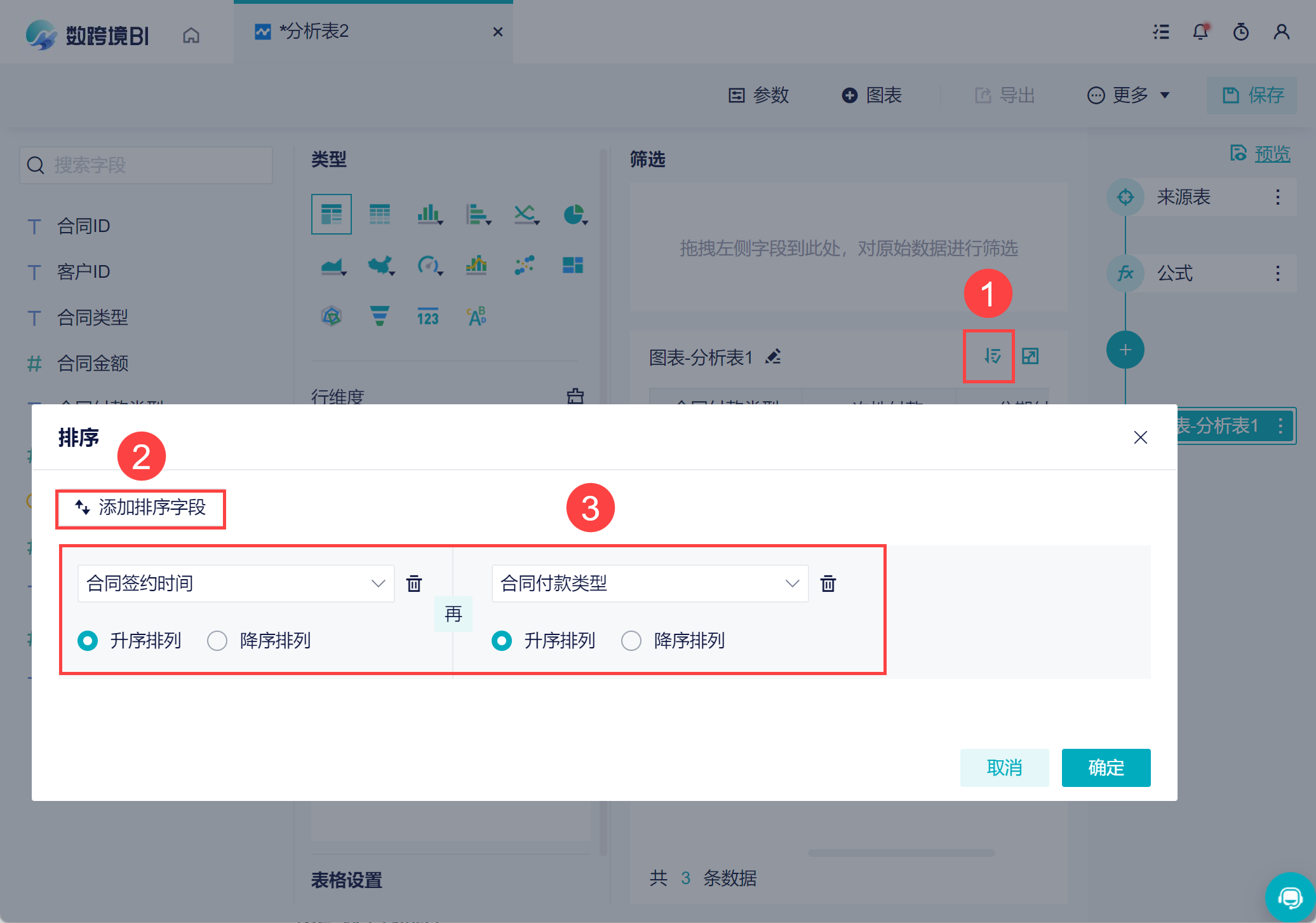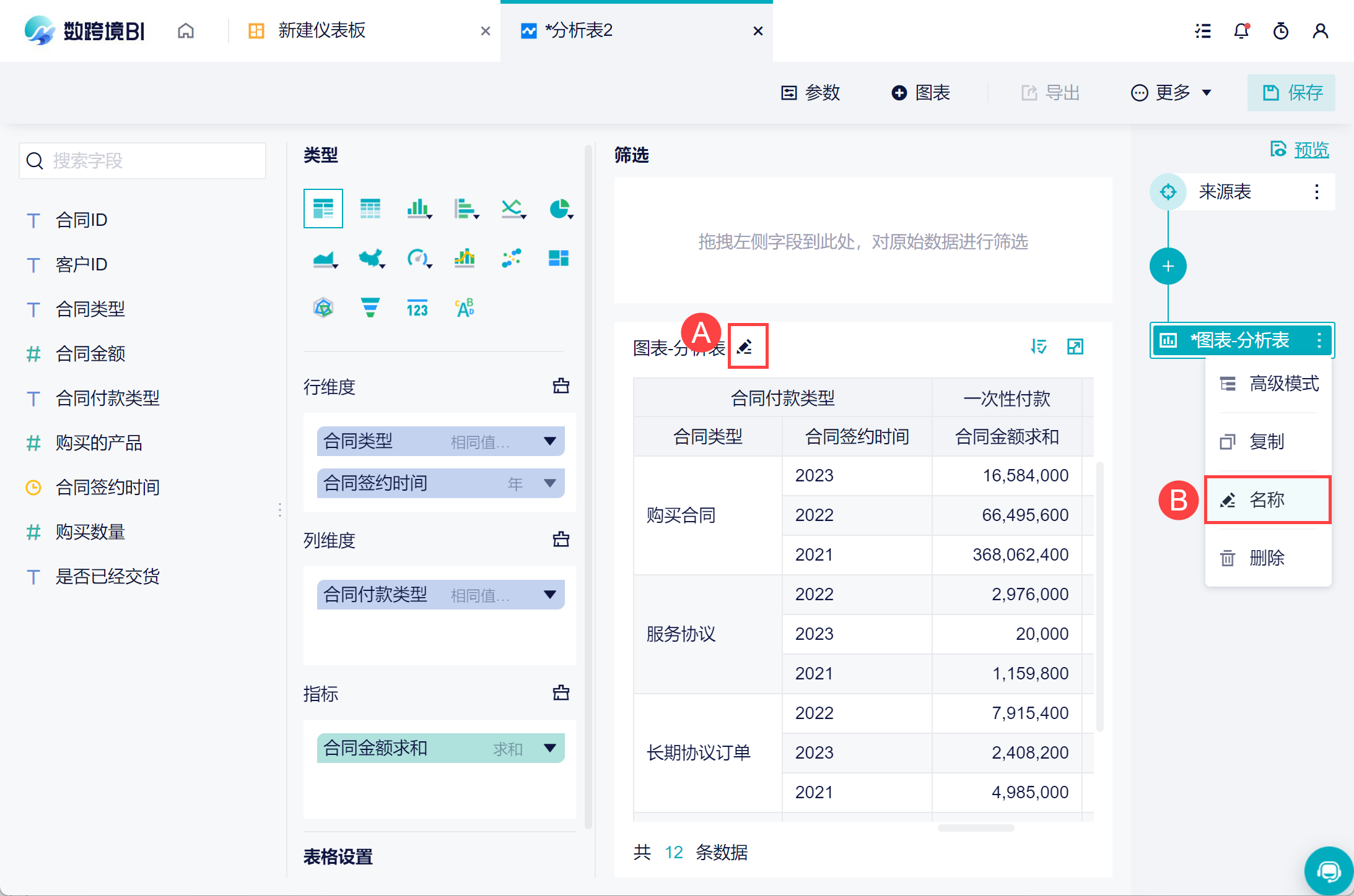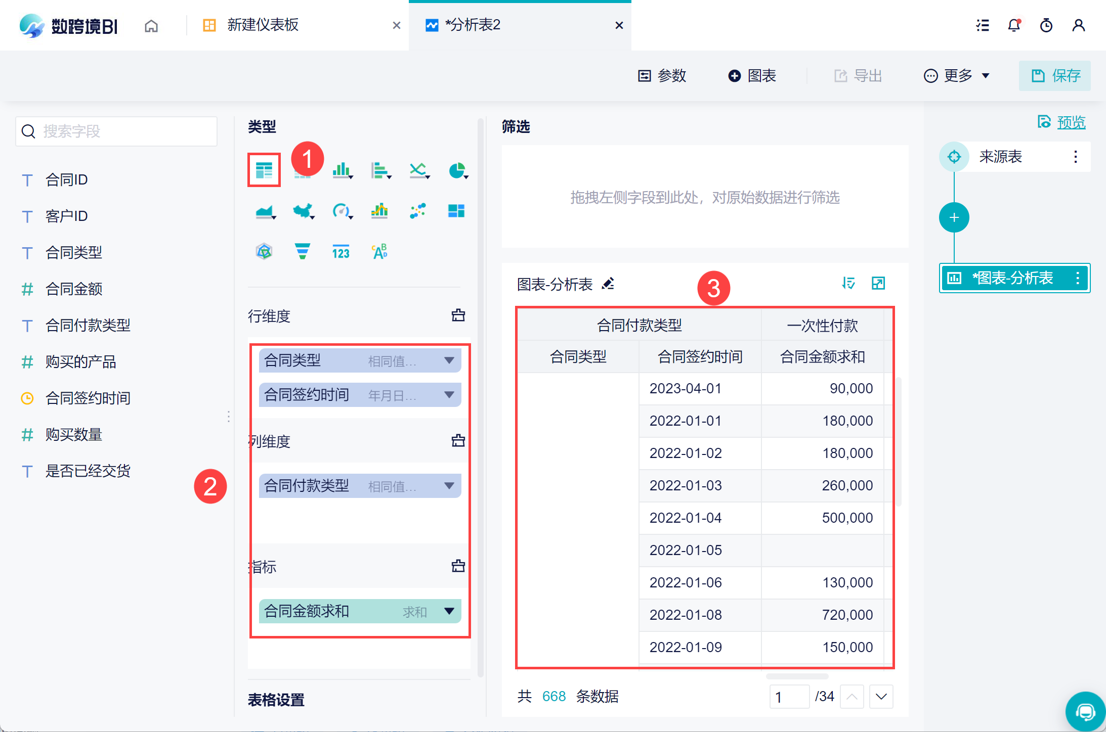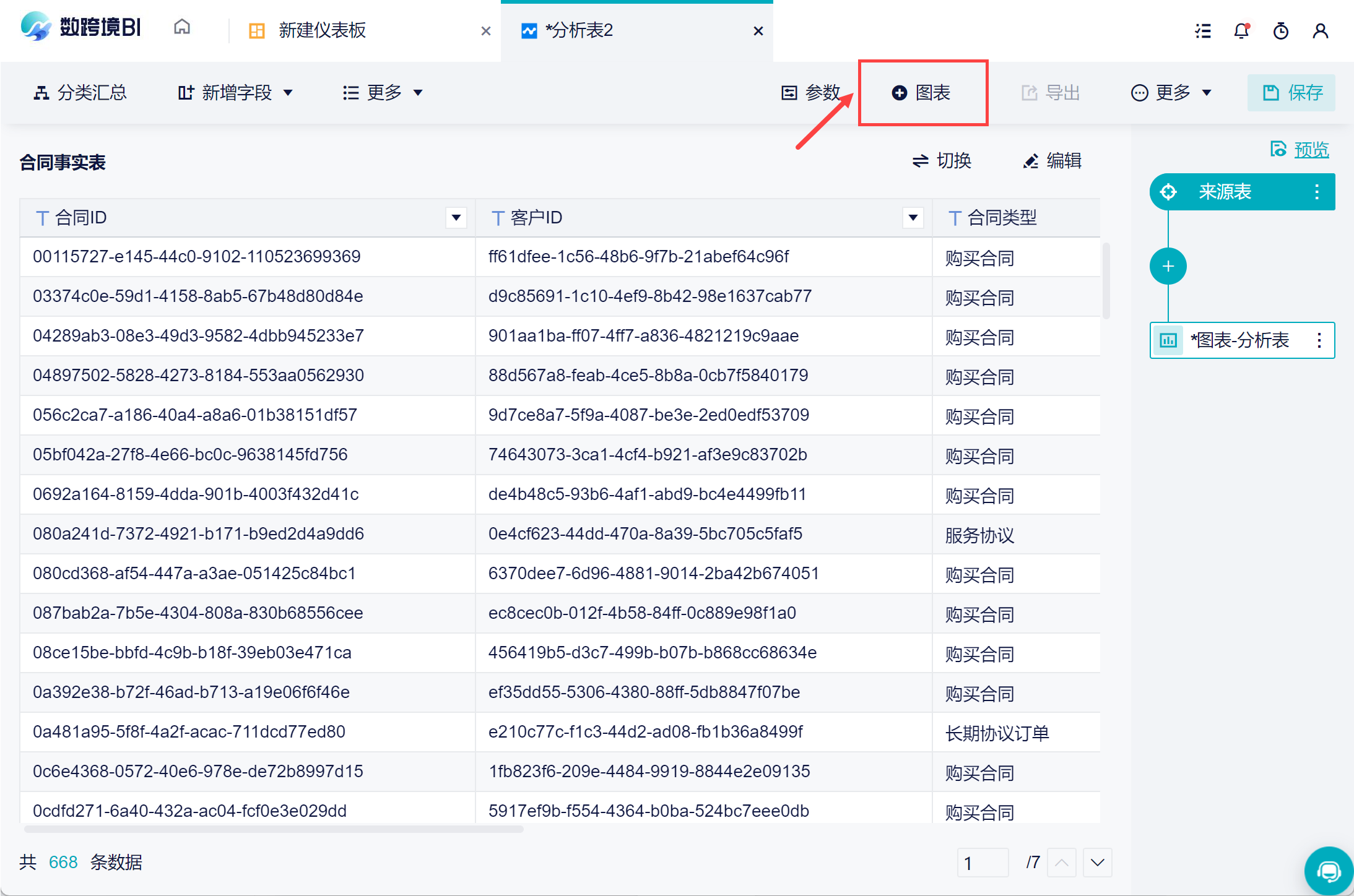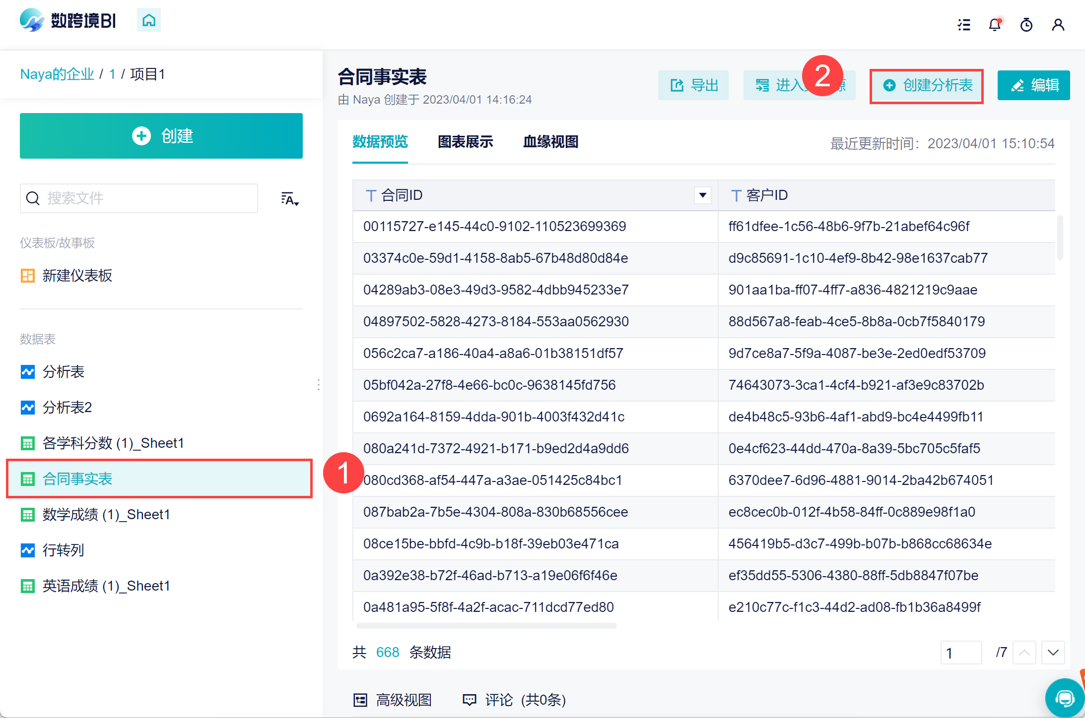 1)下载示例数据并 上传 至数跨境,将「合同事实表」保存在项目中,选择创建一张分析表,如下图所示:
