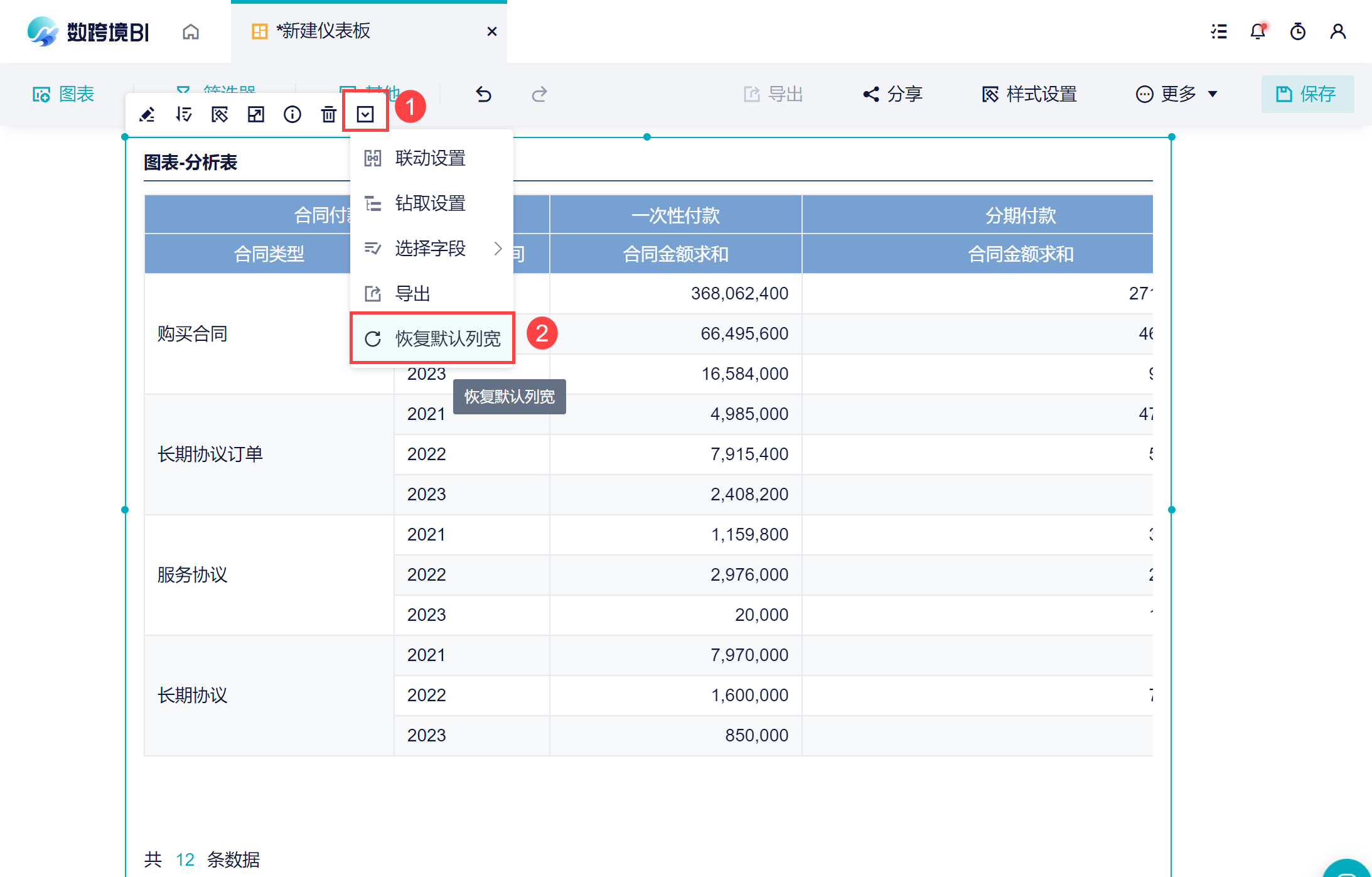 2)如果想要恢复成默认的列宽,可以在仪表板编辑界面,点击「恢复默认列宽」,那么手动设置的列宽就会清除。如下图所示: