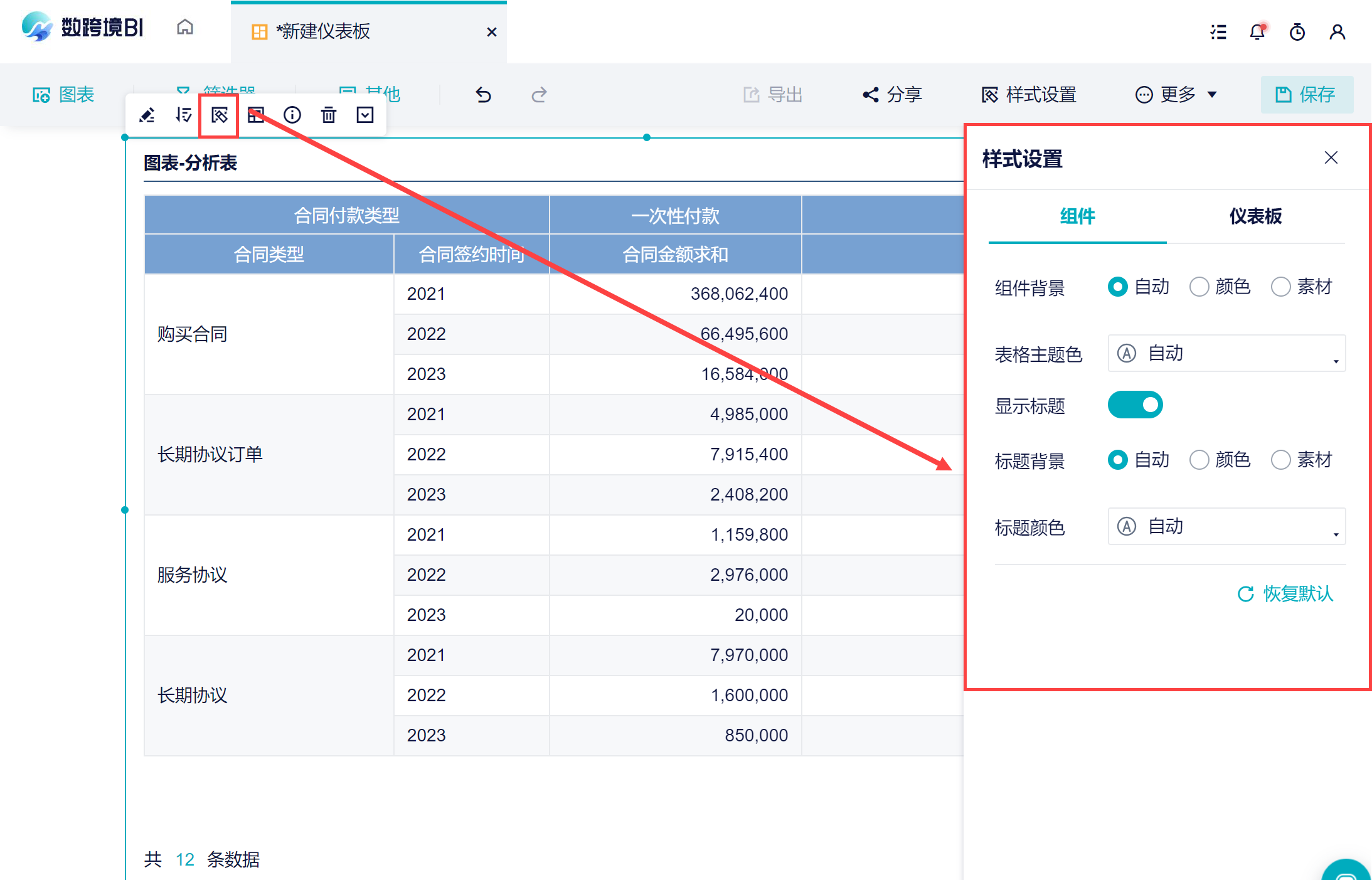 在仪表板中点击「样式」按钮,可以对明细表的表格主题色、标题背景、标题颜色等等进行设置。详情参见文档:样式设置