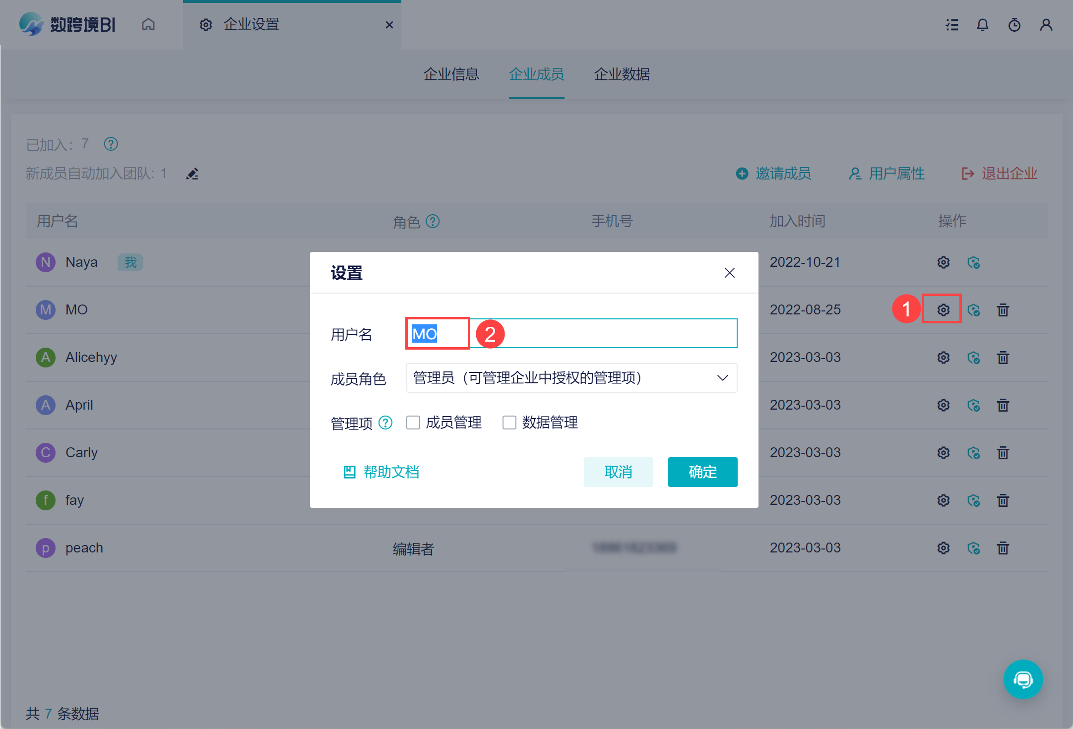 • 是否可管理企业数据,并给其他成员分配权限