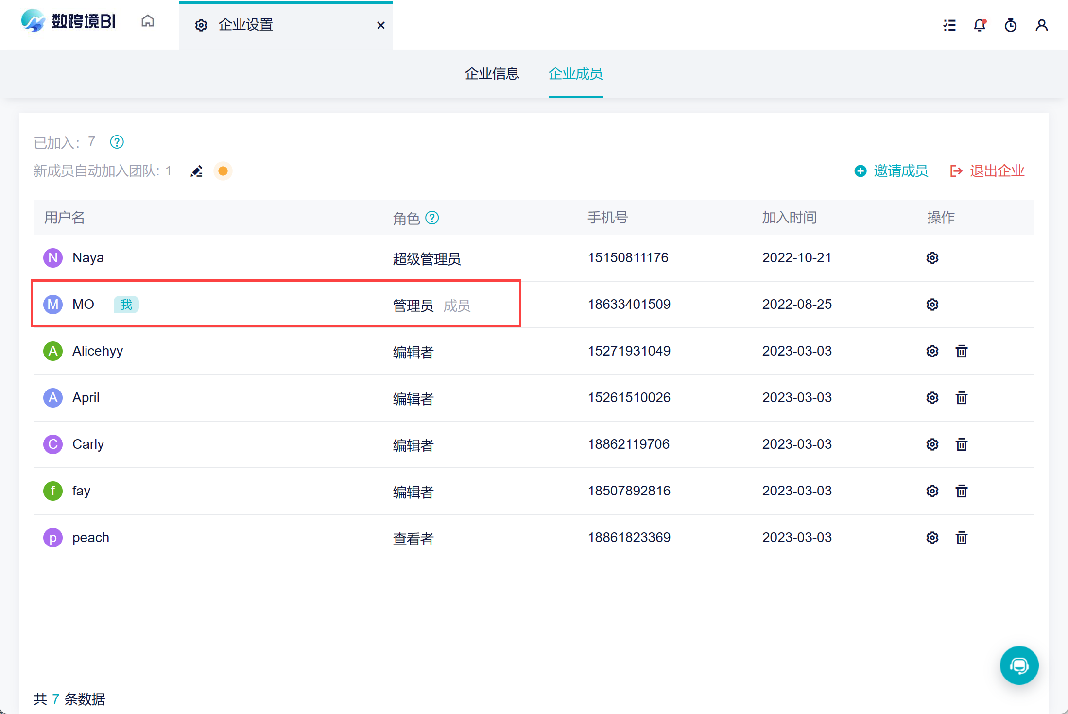 在「企业成员」模块,可以邀请成员进入企业、删除成员、配置用户属性等等。