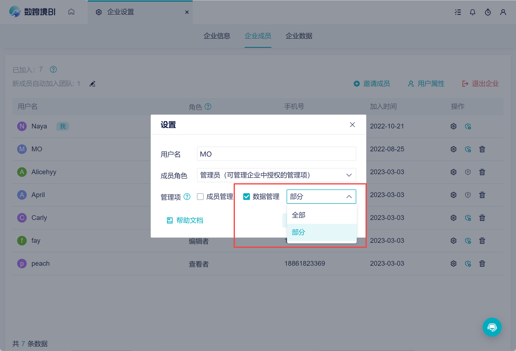 超管给其他成员分配数据管理权限时,可以选择分配「全部」或者「部分」: