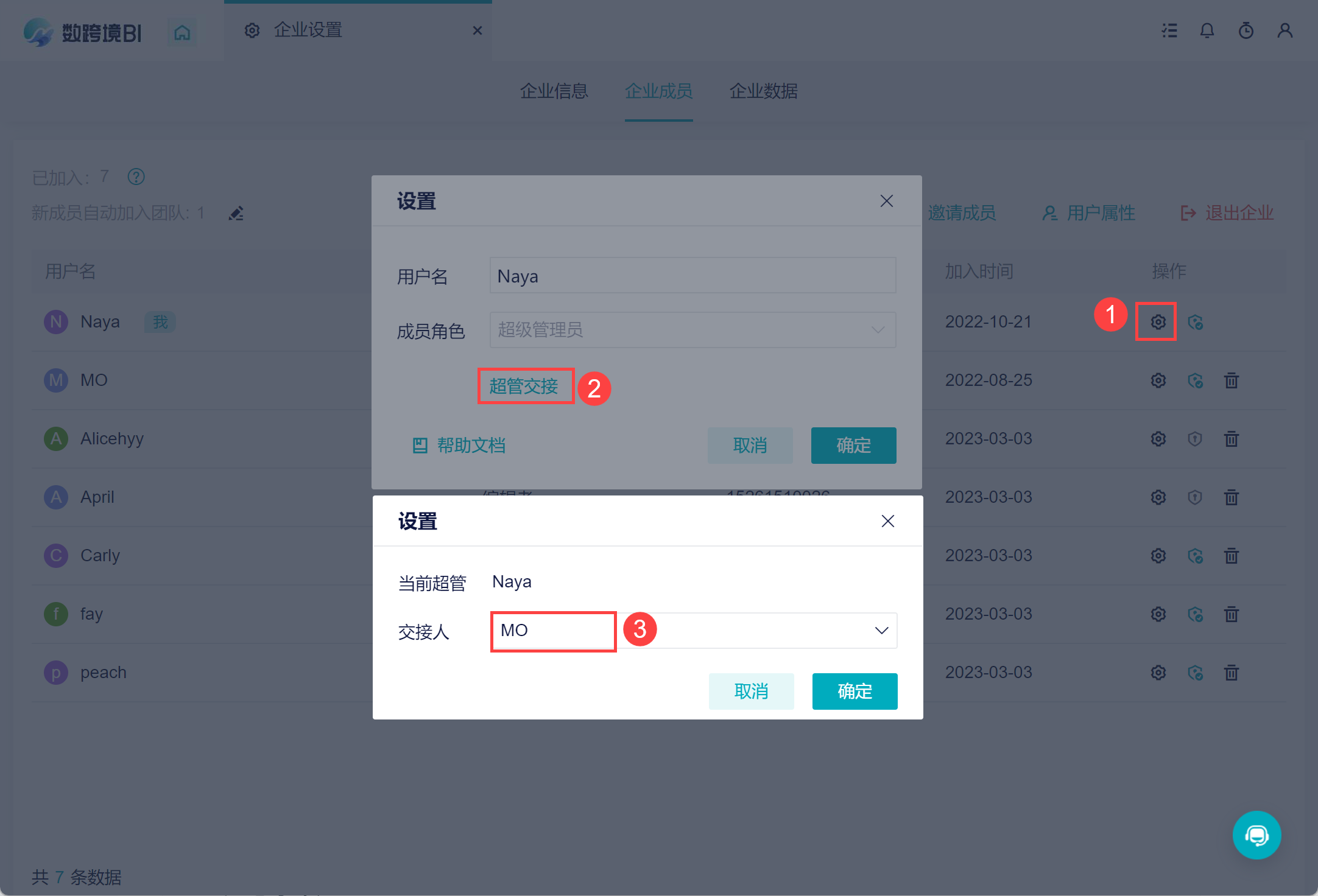 超级管理员可以将超管权限移交给其他成员,这是不可自行撤销的操作,请谨慎操作。如下图所示: