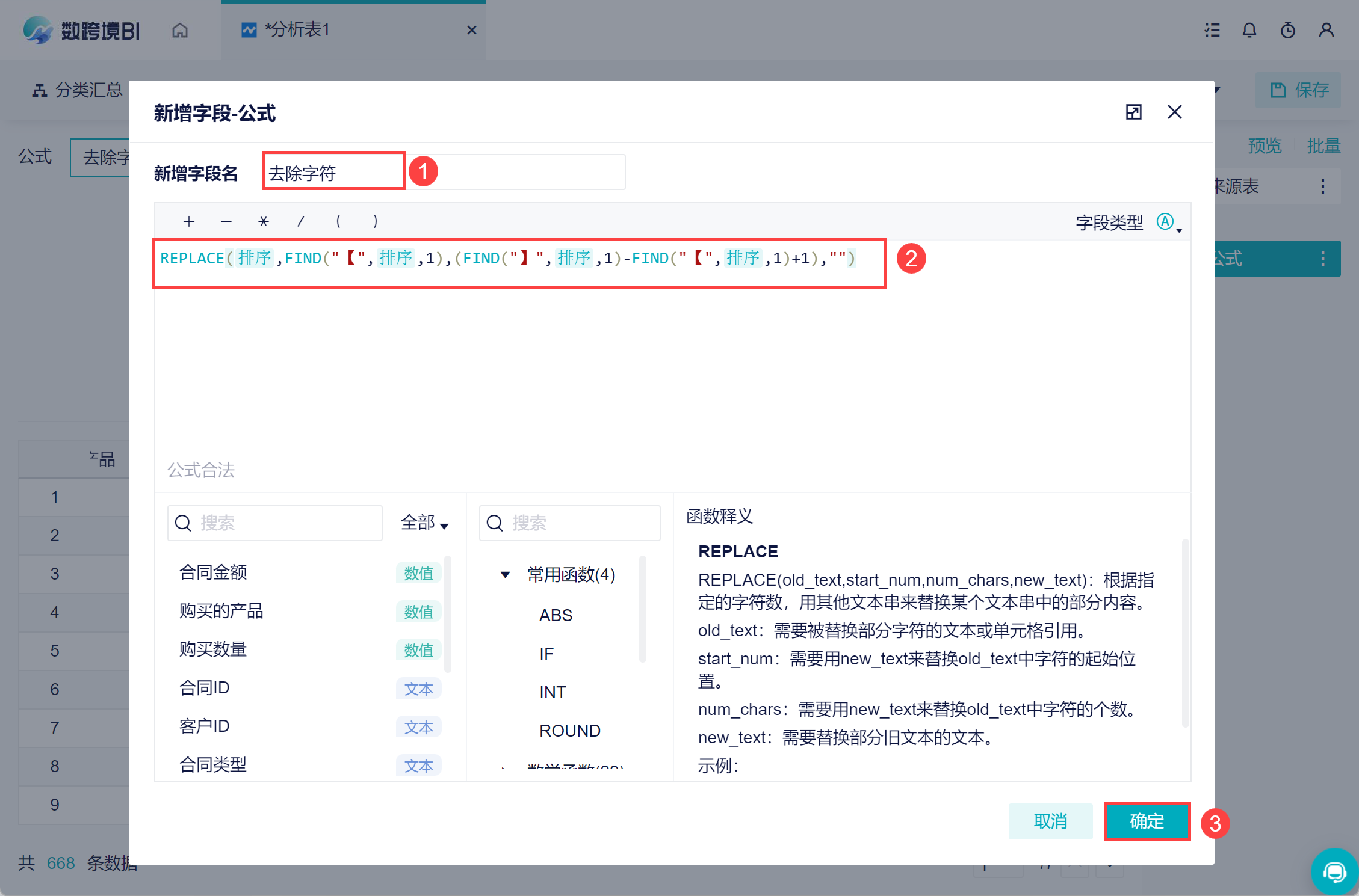 2)新增字段命名为「去除字符」,输入公式:REPLACE(排序,FIND("【",排序,1),(FIND("】",排序,1)-FIND("【",排序,1)+1),""),点击「确定」,如下图所示: