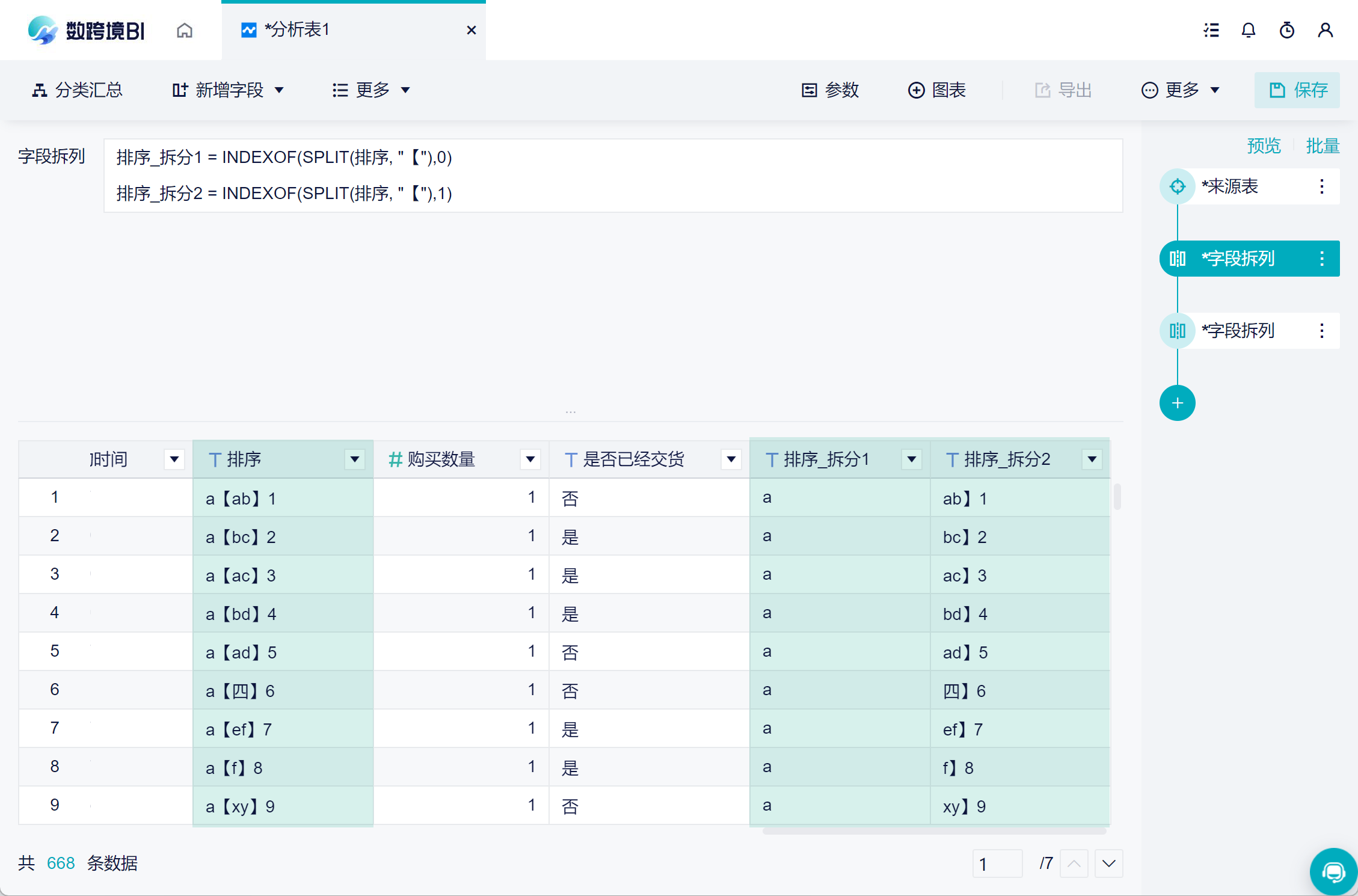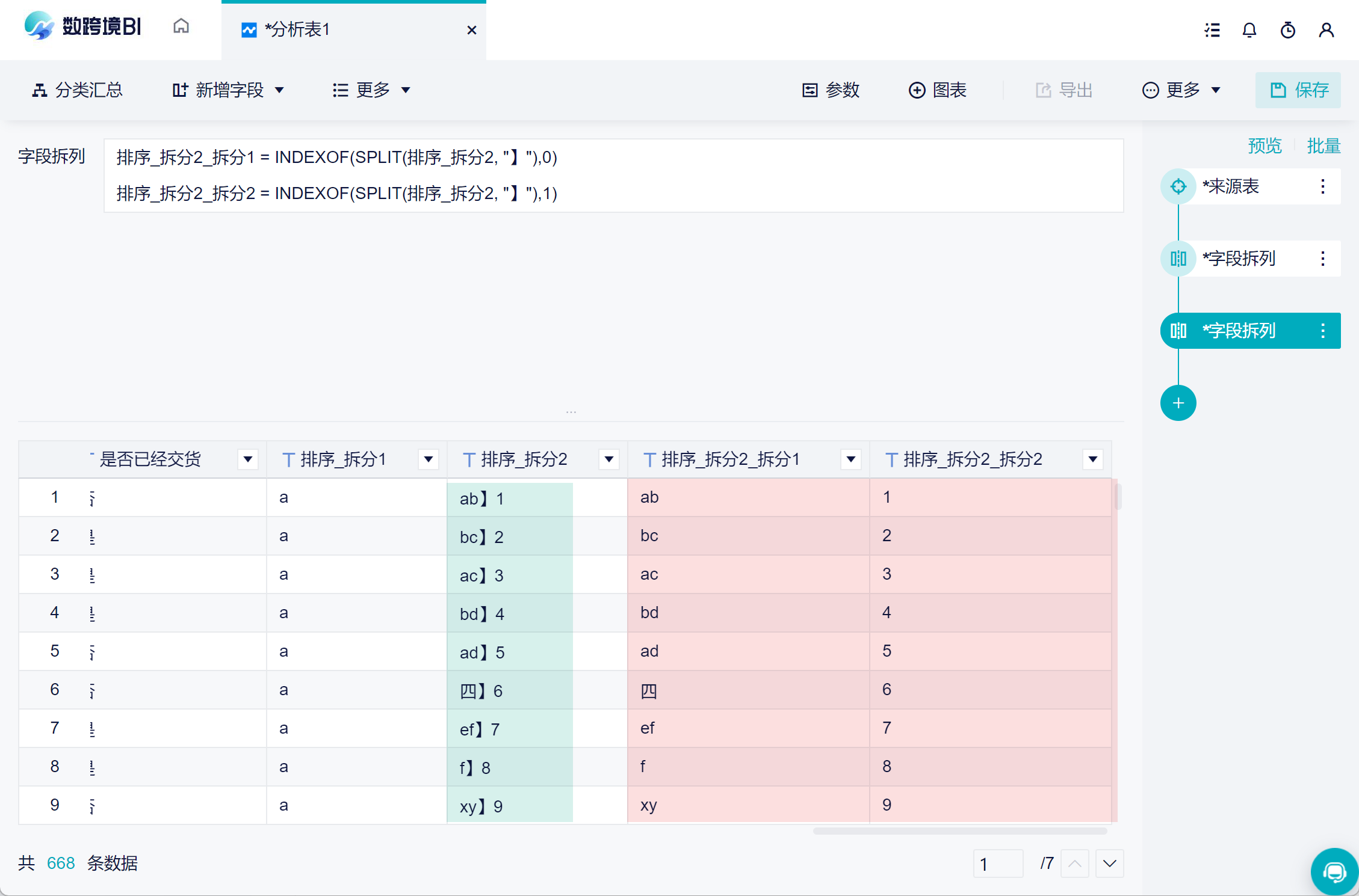 2)再使用「字段拆列」功能,根据指定分隔符「】」拆分成两列,如下图所示: