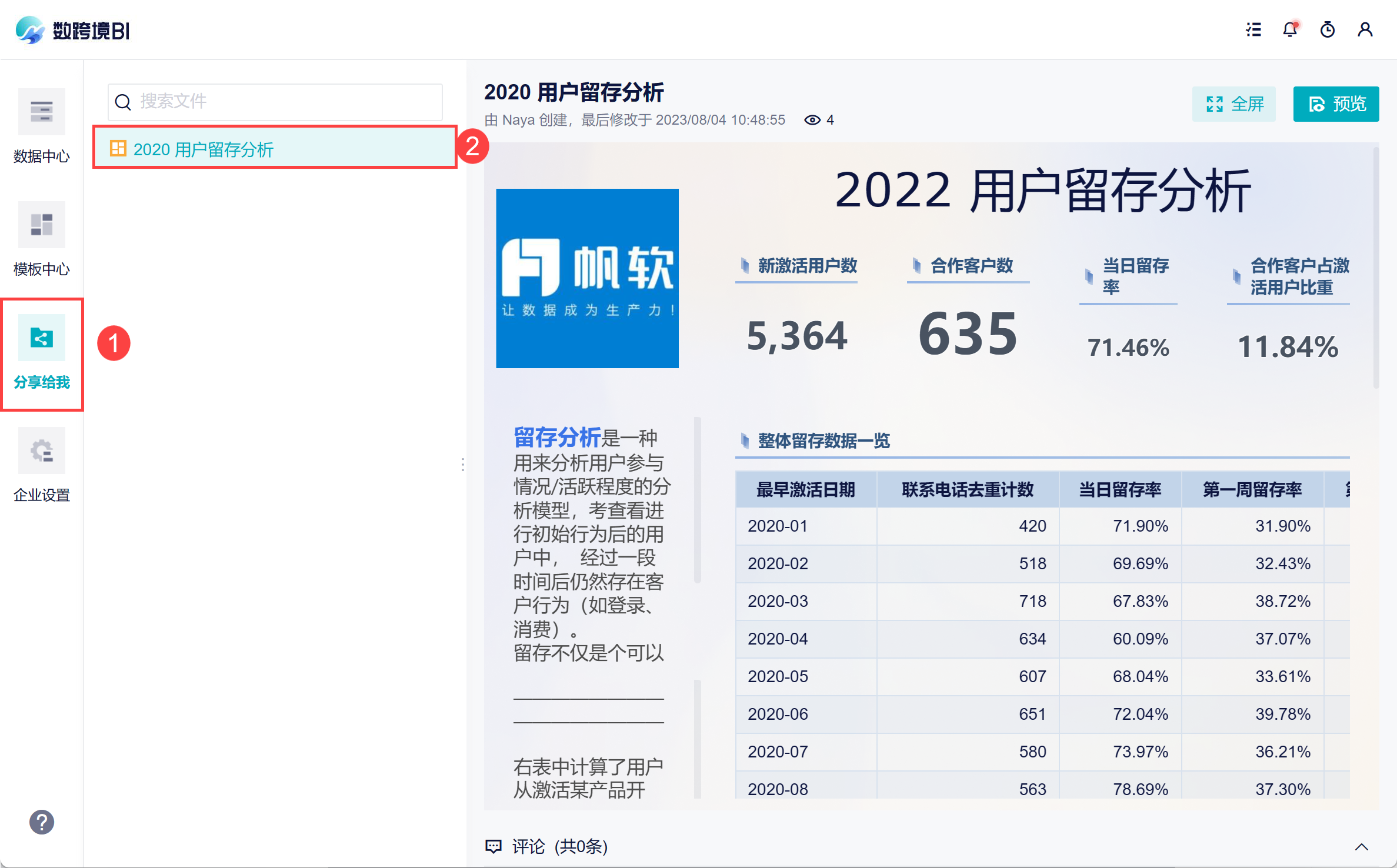 企业内分享:可以将仪表板分享给指定成员,被分享成员可直接在侧边栏「分享给我」中查看。