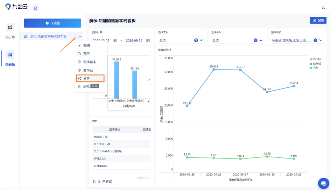 如果我们已经做好了仪表板,可以在仪表板列表种找到该仪表板,点击右侧的“…”,在下拉菜单中找到分享,点击分享。