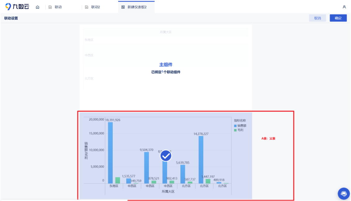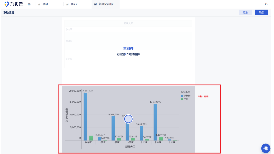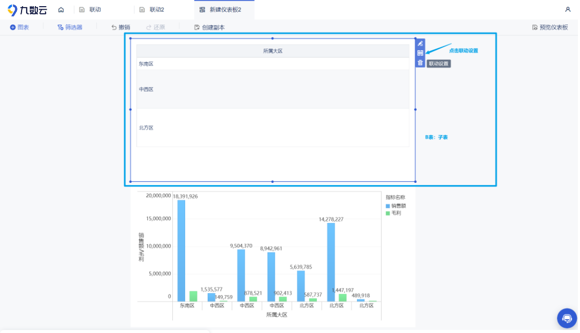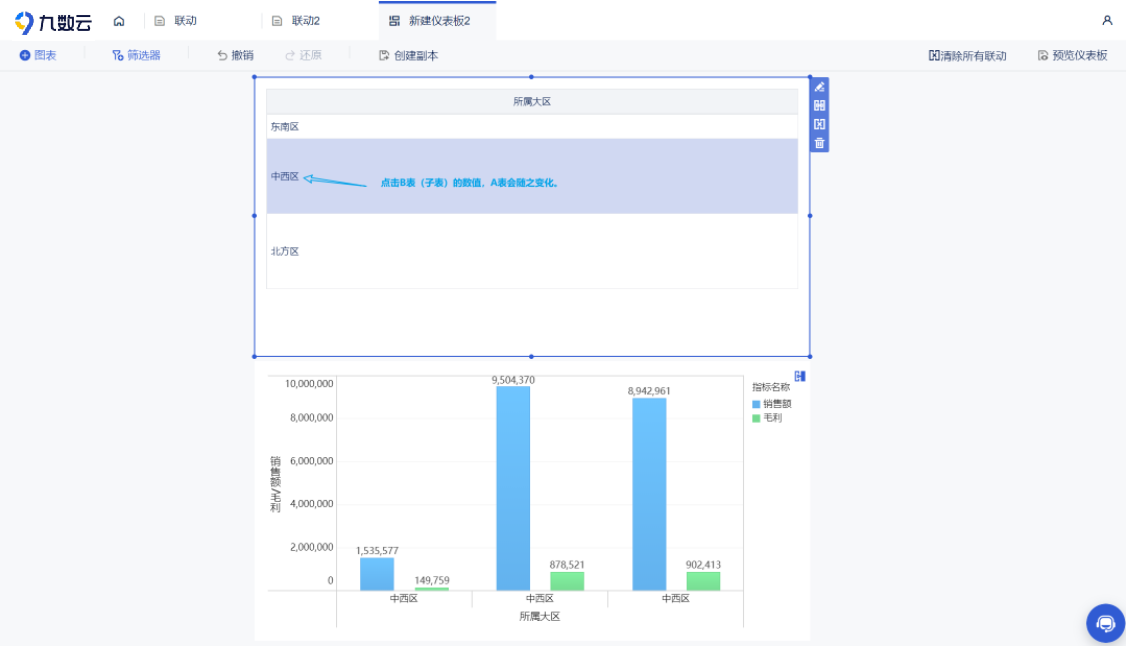 联动:单击仪表板中某个图表中的某个区域或字段时,仪表板中和这个图表相关的其他图表的内容会发生联动变化。