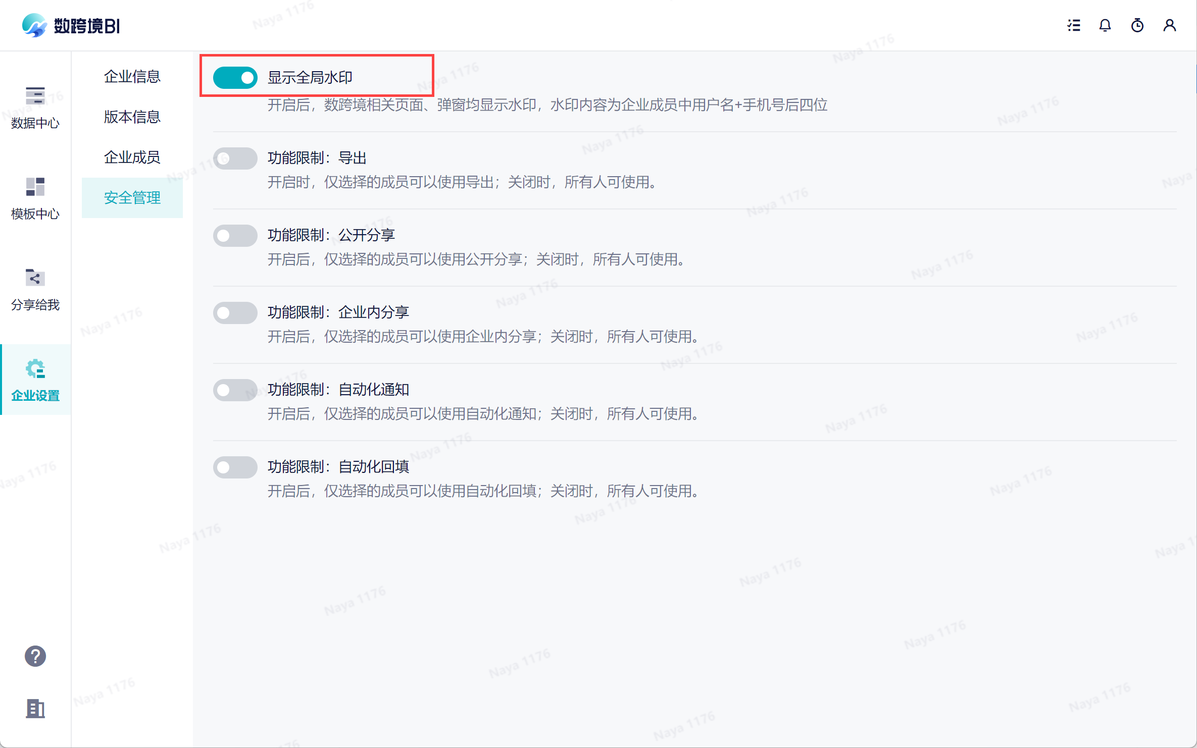 | 显示全局水印 | 开启后,数跨境相关页面、弹窗均显示水印。 水印内容为企业成员中用户名+手机号后四位; | |