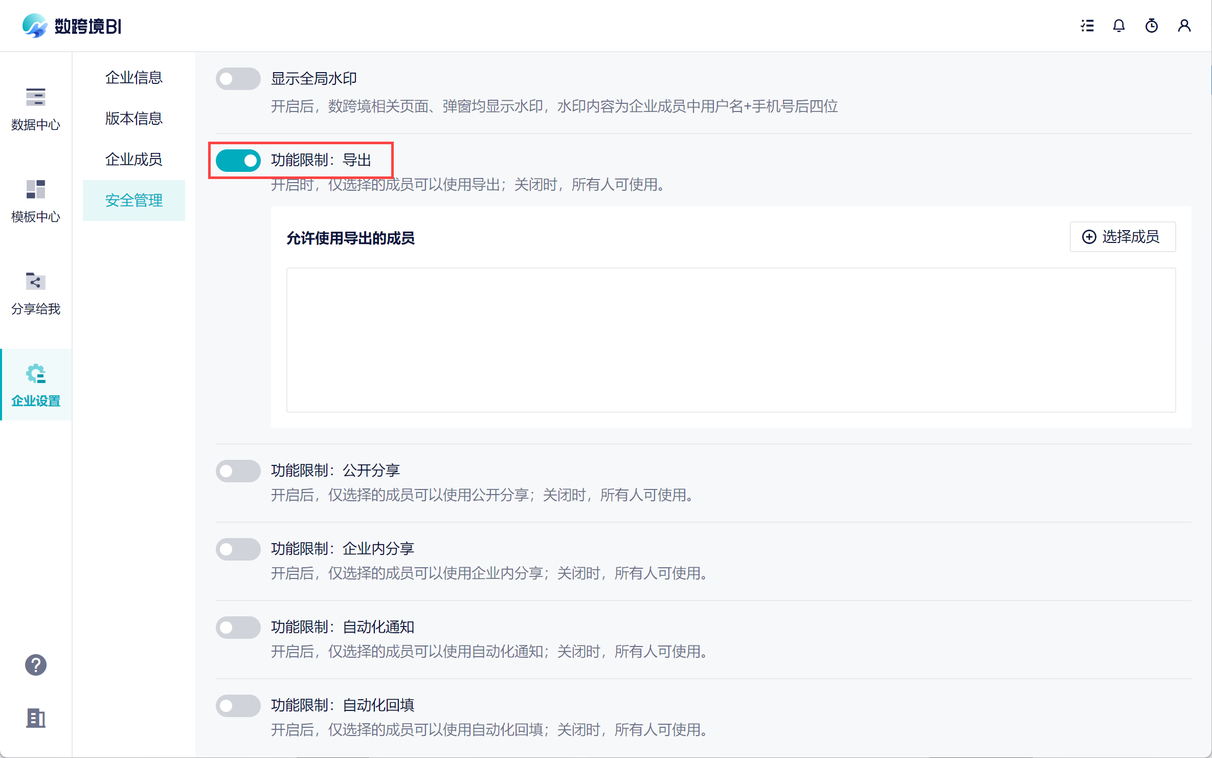 1)「导出」功能可以导出分析表、仪表板仪表板,开启「功能限制:导出」后,仅选择的成员可以使用导出功能。如下图所示: