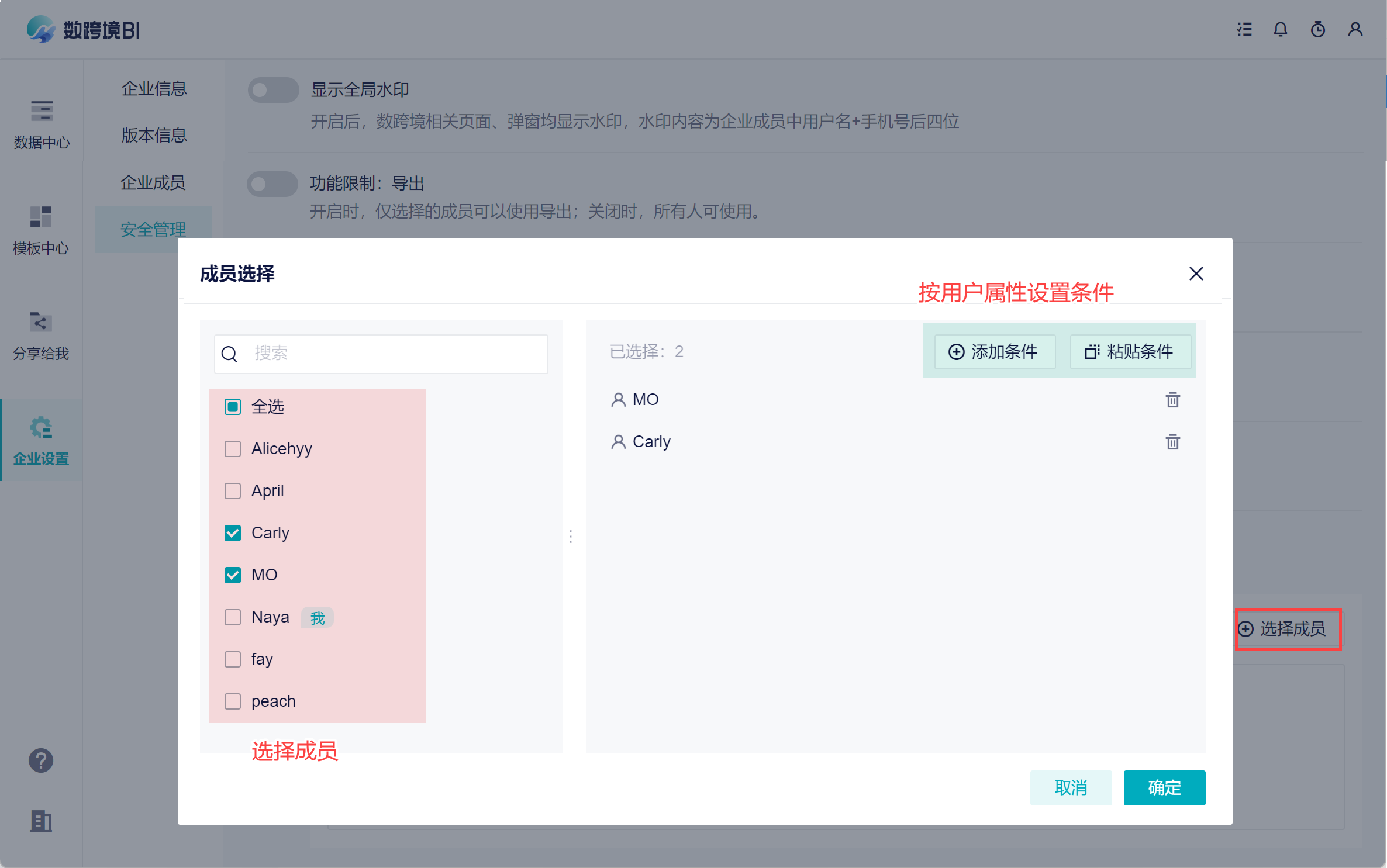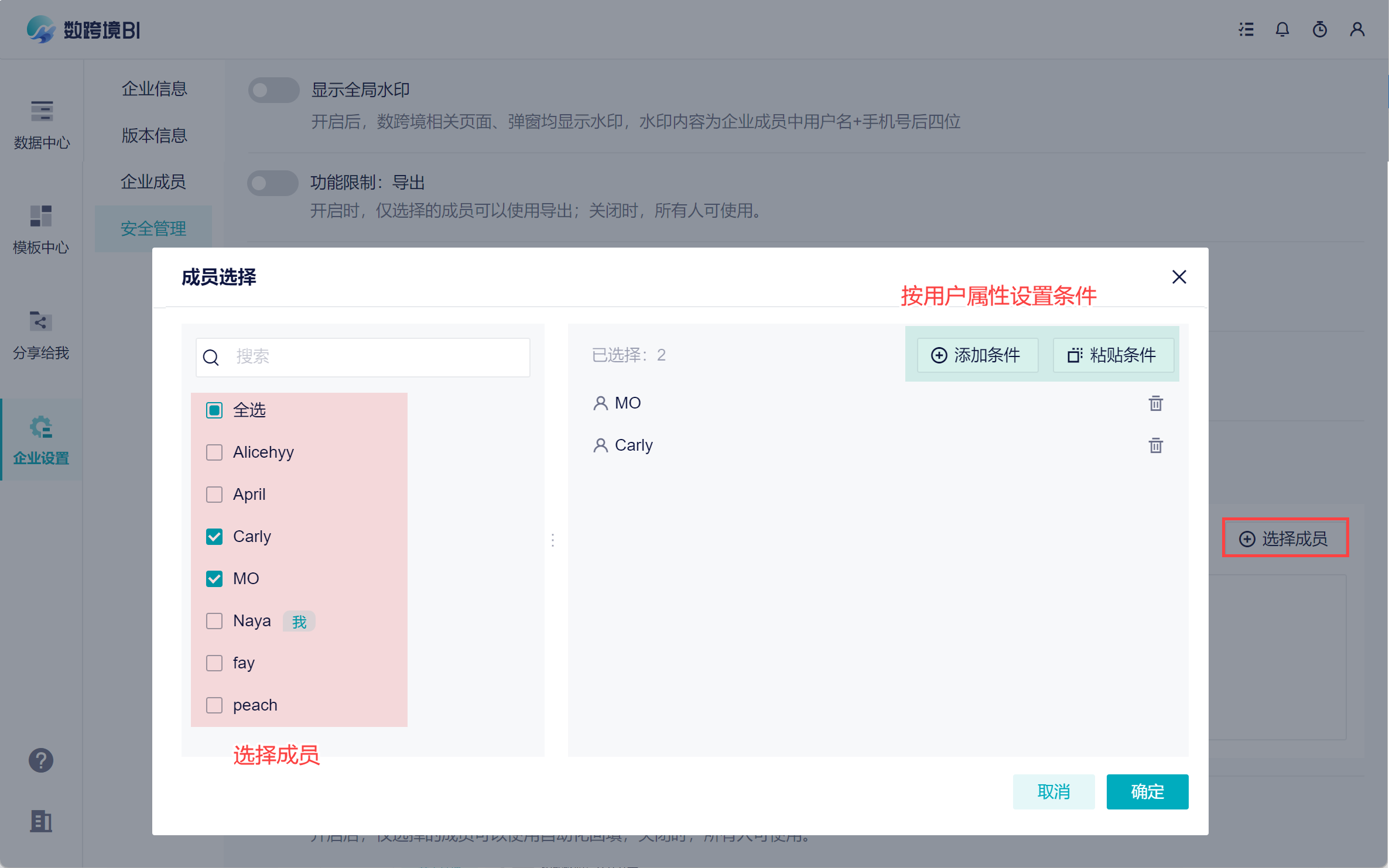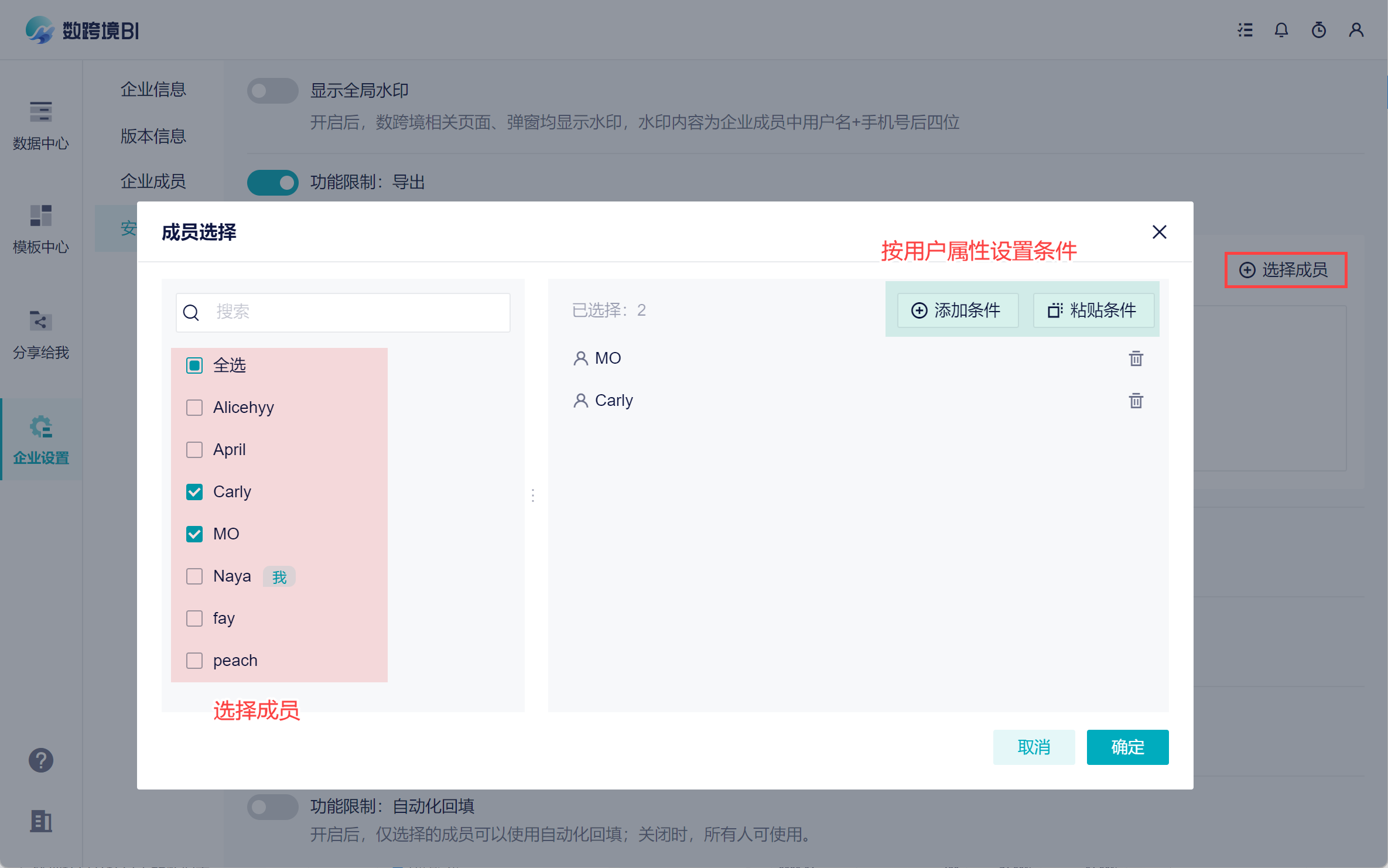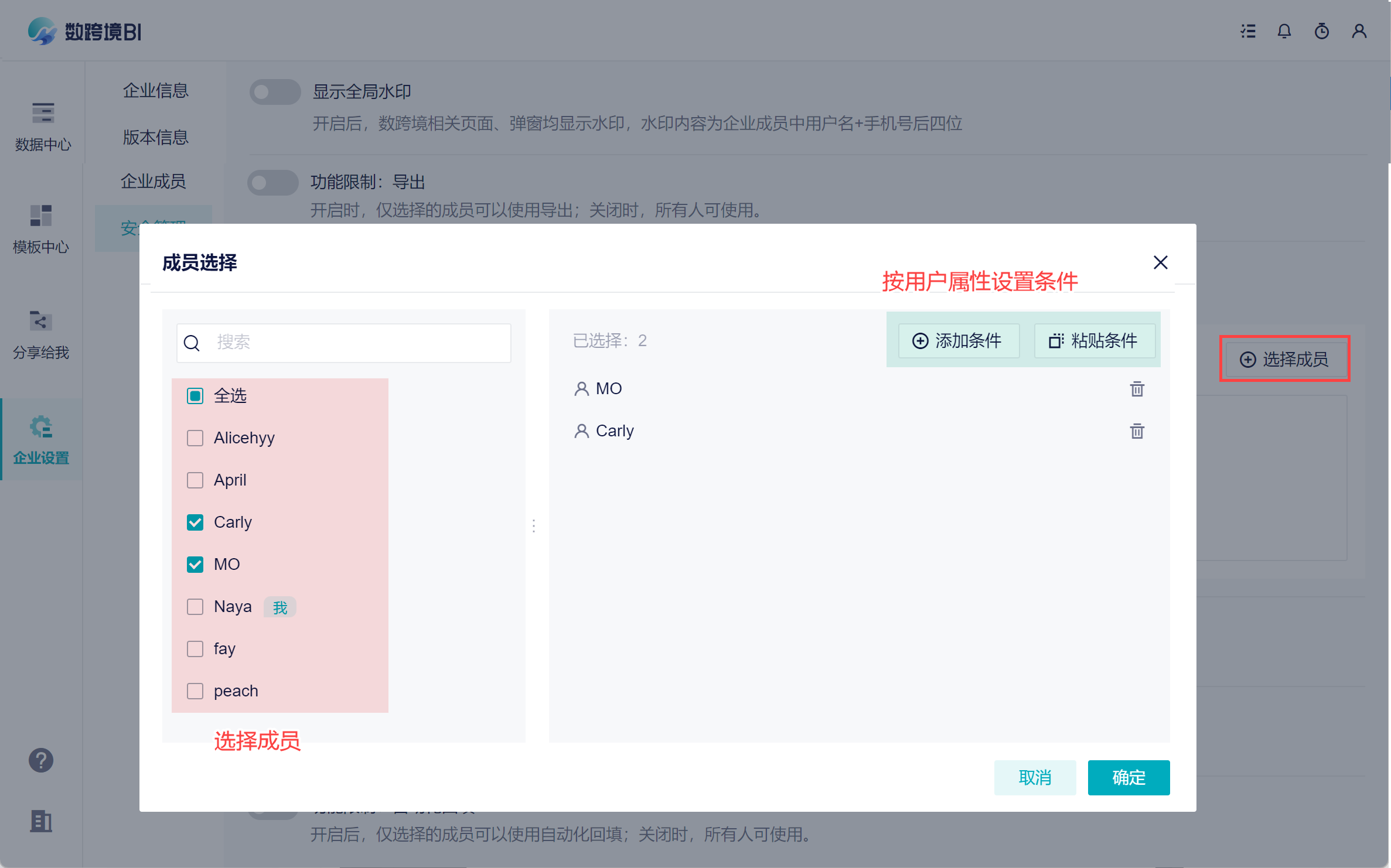2)点击「选择成员」,在弹窗中可以选择具体的成员,也可以自定义设置条件: