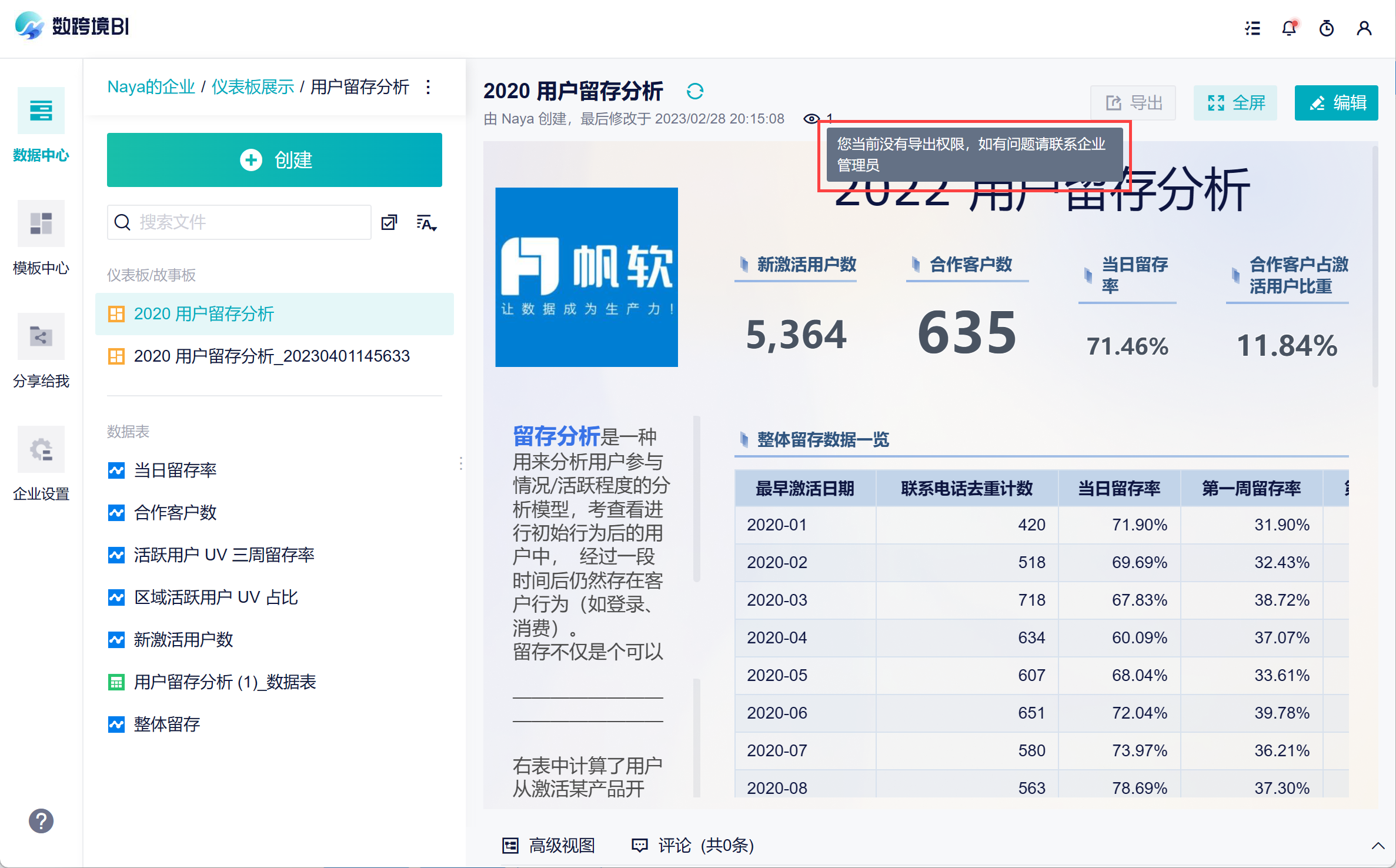 3)有导出权限的成员,可以正常导出分析表或者仪表板。没有导出权限的成员,导出按钮灰化,不可导出数据。如下图所示:
