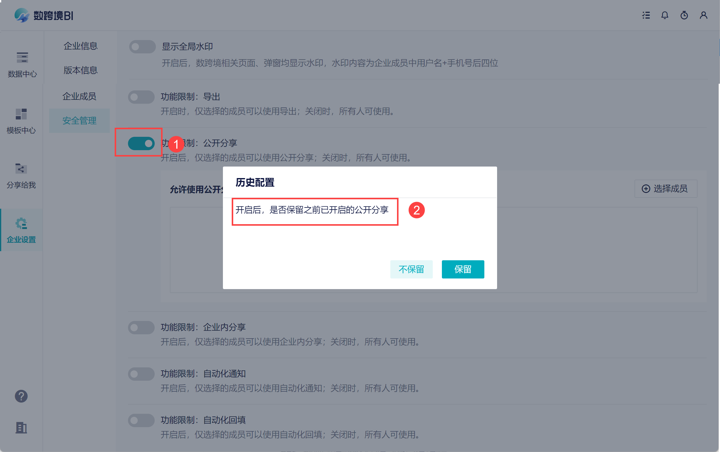 1)打开「公开分享/企业内分享」的按钮后,可以设置是否保留之前已开启的公开分享/企业内分享: