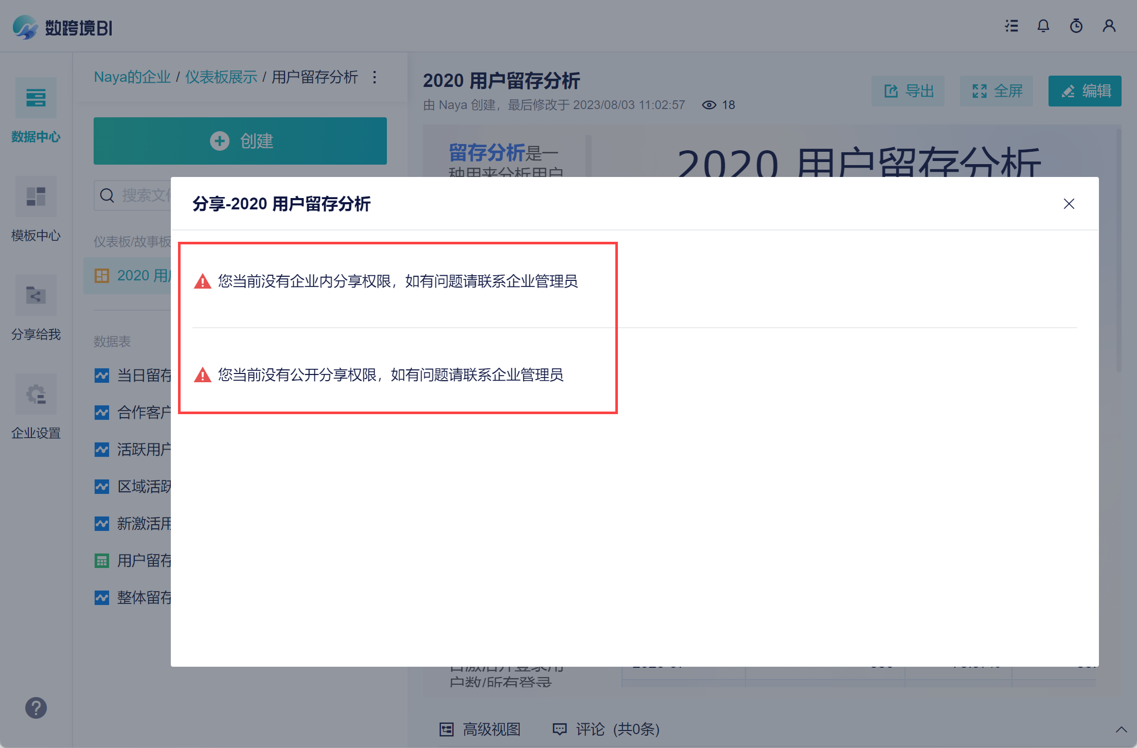 3)有分享权限的成员可以分享仪表板或者故事板,而未被选择的成员在使用分享功能时,提示没有相关权限,如下图所示: