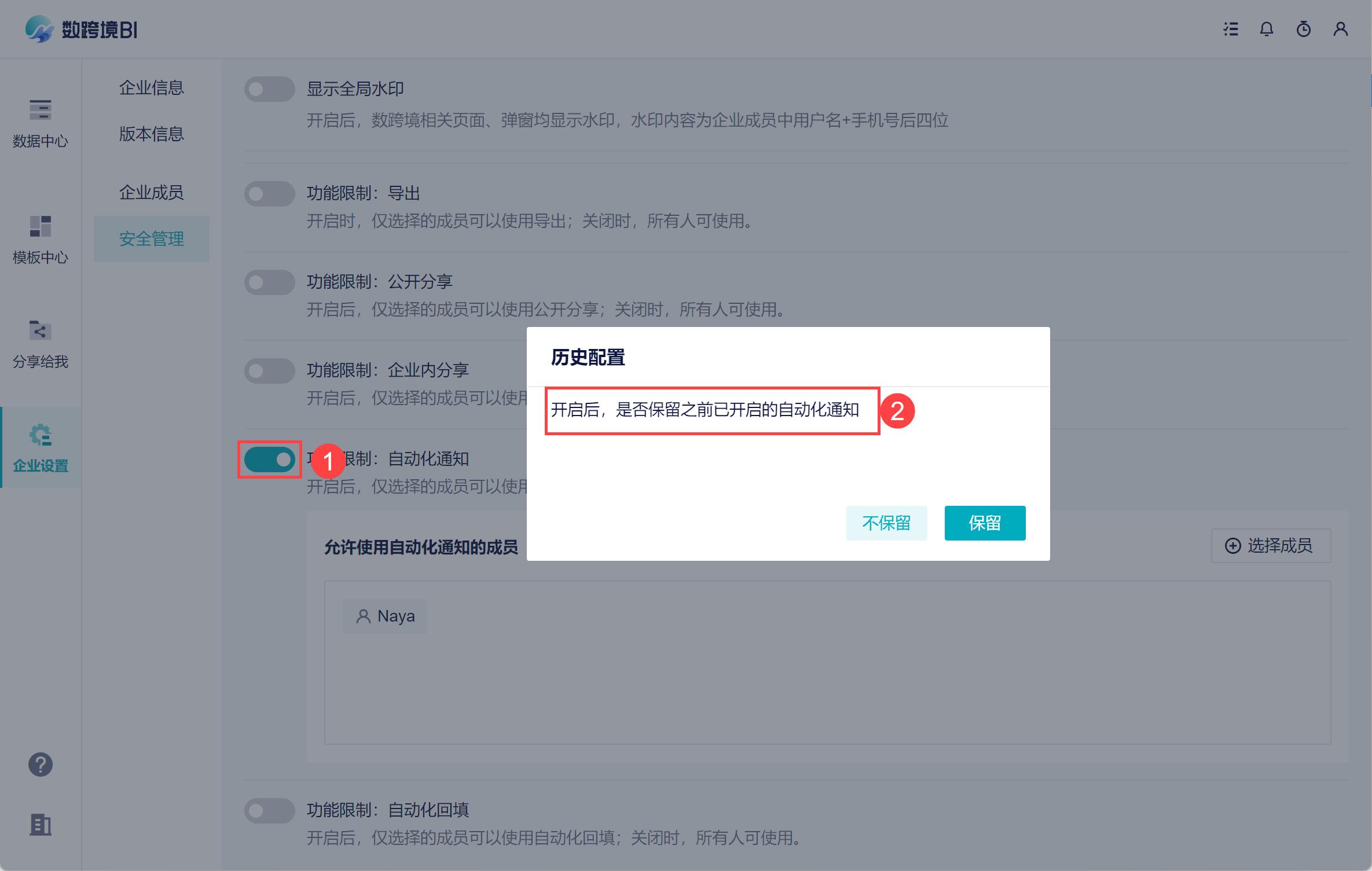1)打开「自动化通知限制」的按钮后,可以设置是否保留之前已开启的自动化通知: