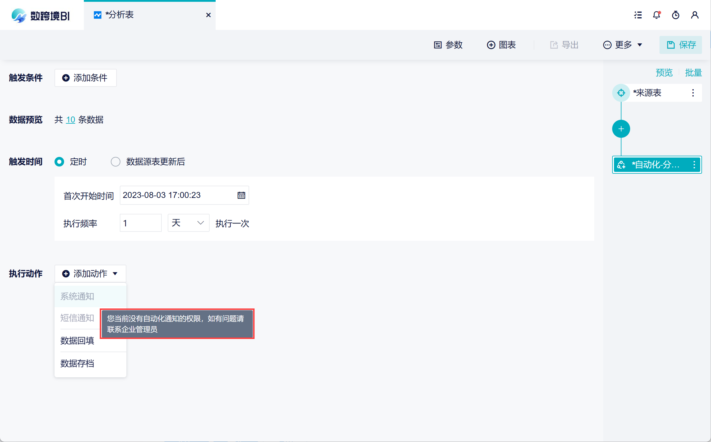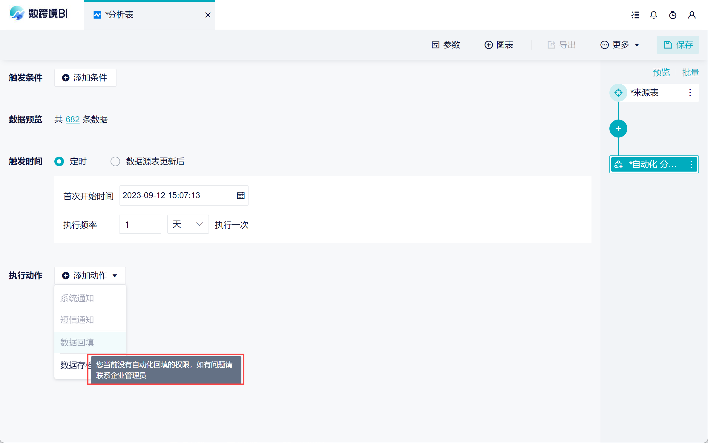 3)未被选择的用户在分析表中使用「自动化功能」时,提示没有权限,如下图所示: