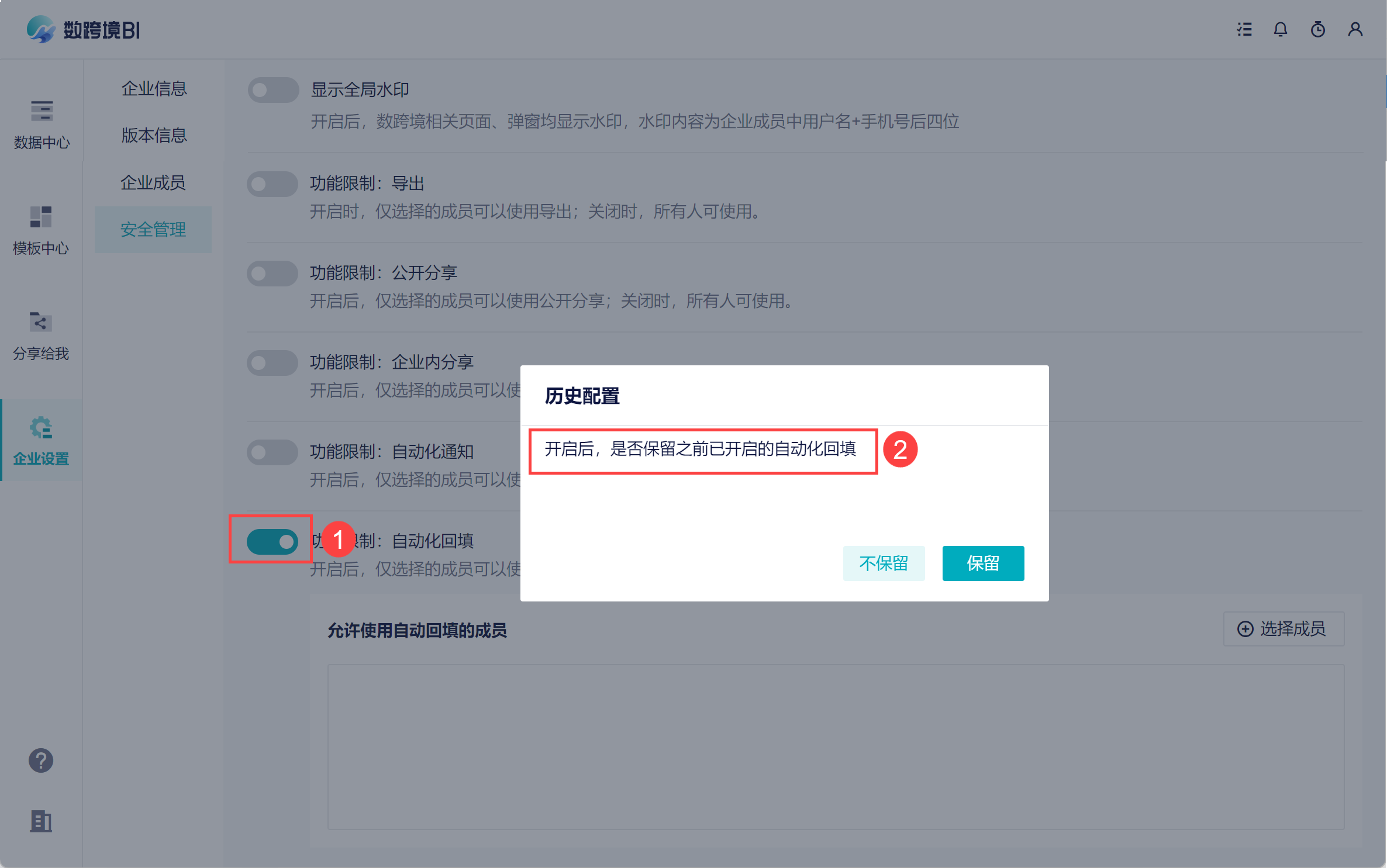 1)打开「自动化回填限制」的按钮后,可以设置是否保留之前已开启的自动化回填配置:
