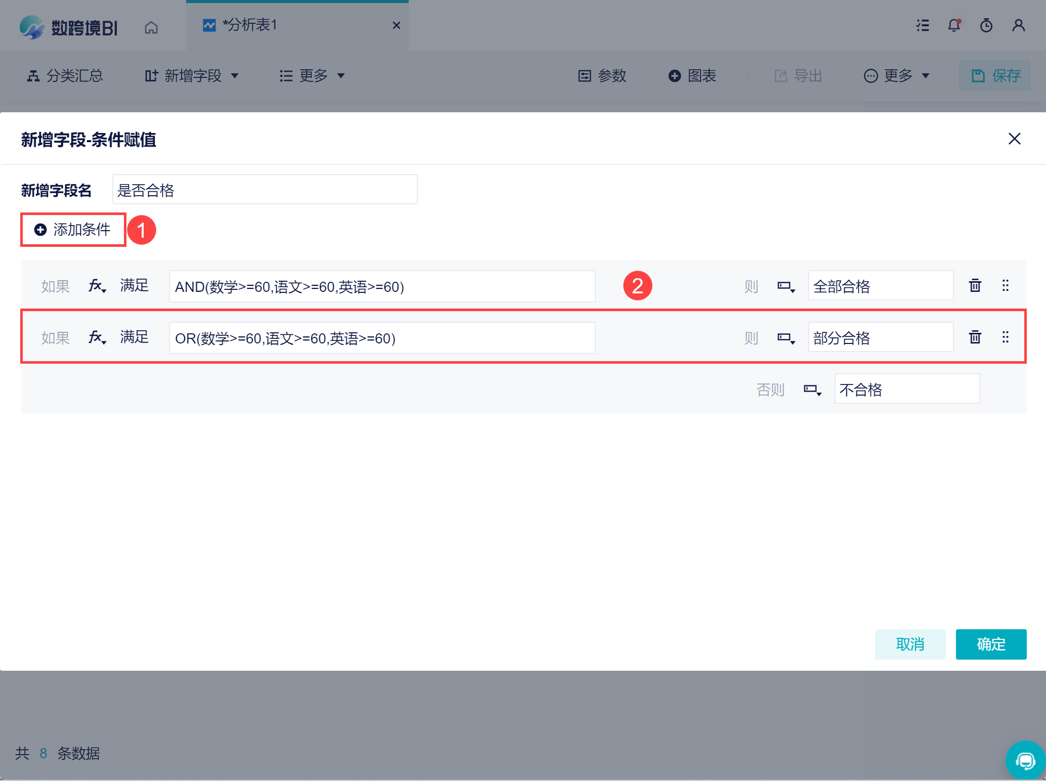 1)在条件赋值中,先切换成「公式条件」,公式为:AND(数学>=60,语文>=60,英语>=60),判断当三门成绩都大于等于 60 时,那么标签为「全部合格」,如下图所示: