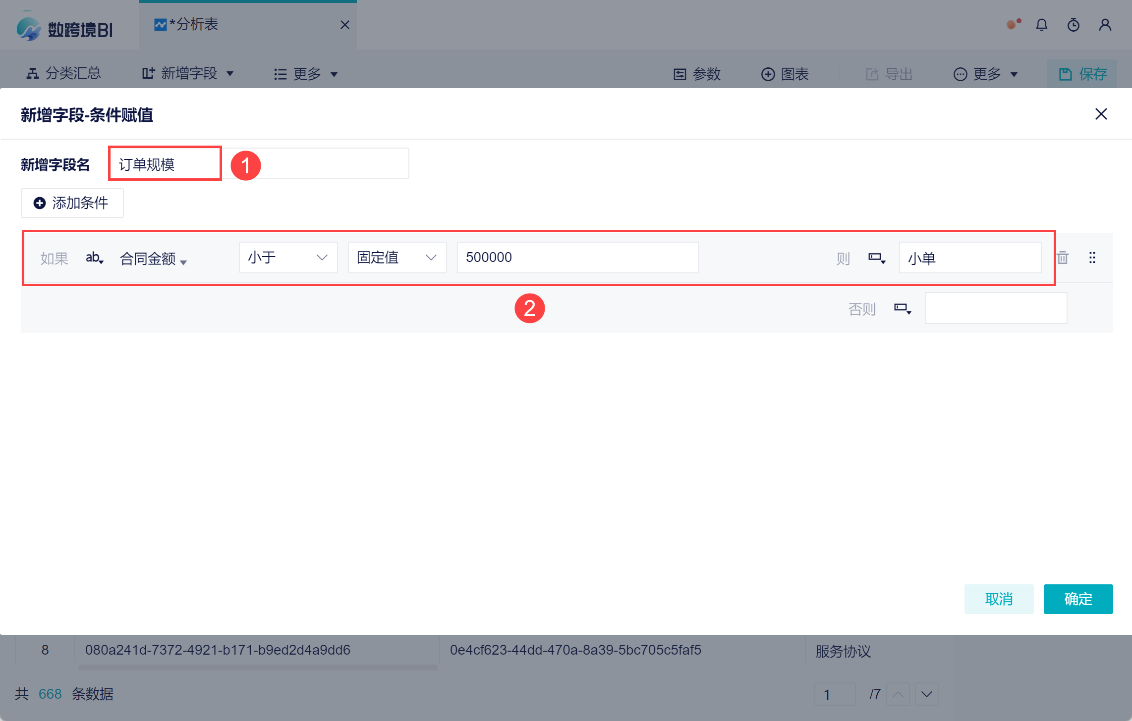 2)新增字段名为「订单规模」,设置第一个条件:合同金额<500000 的,归为小单。如下图所示: