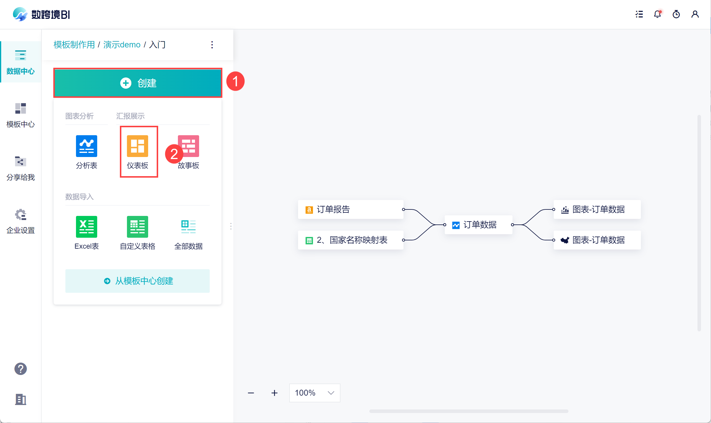 1)制作好图表后,就可以在仪表板中进行展示了。点击「创建>仪表板」,如下图所示:
