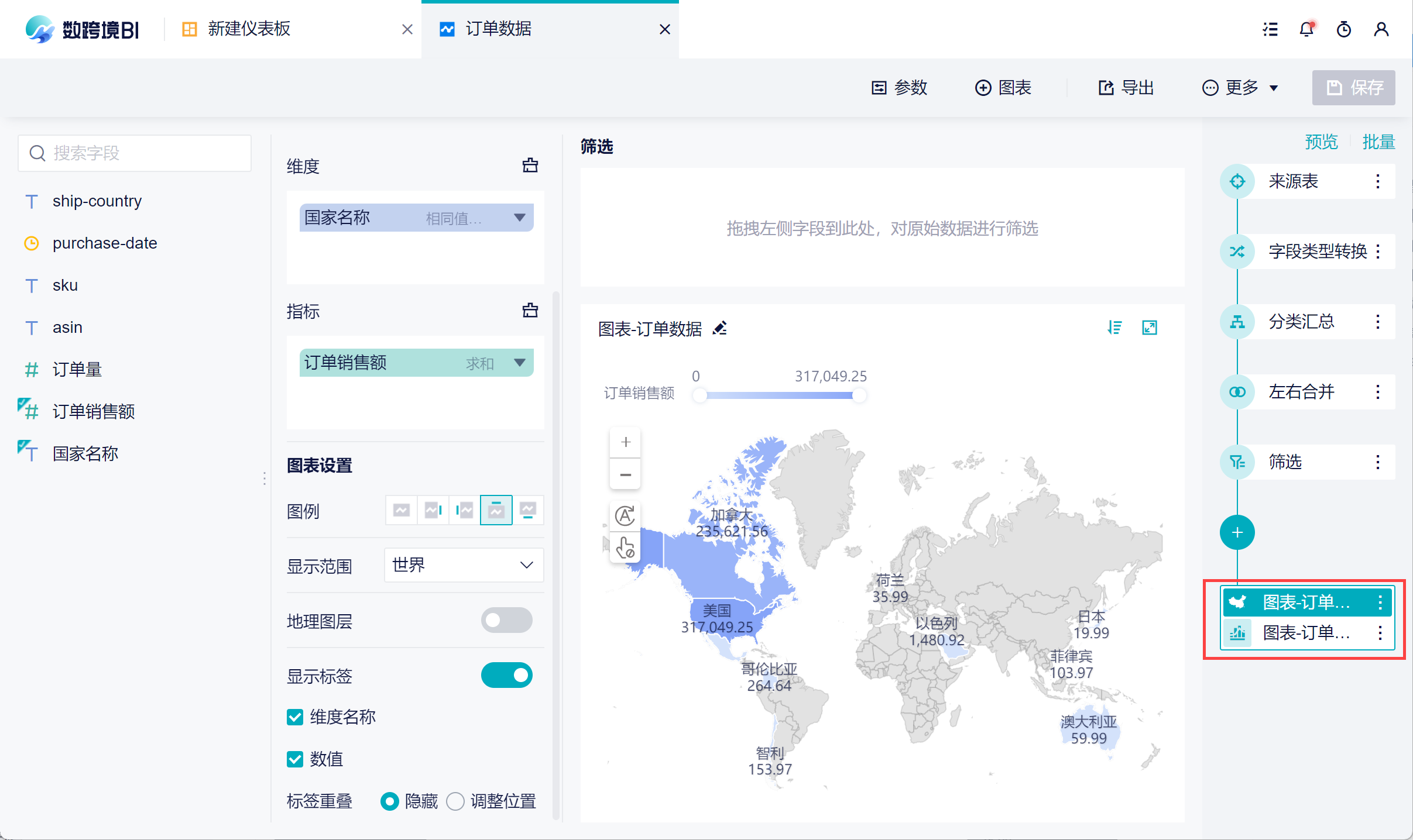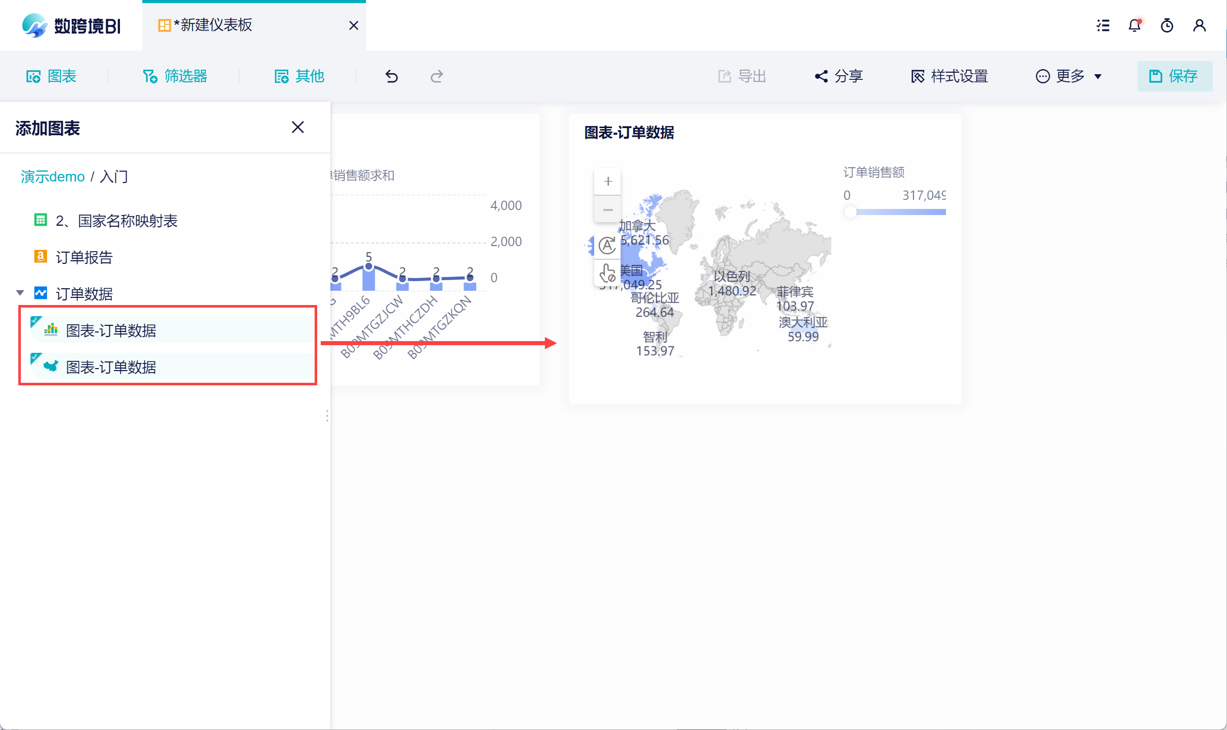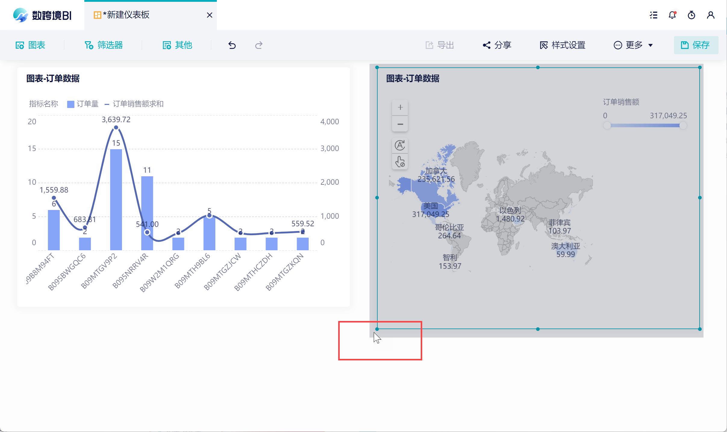 1)在左侧图表列表,将组合图和地图拖入仪表板中。如下图所示: