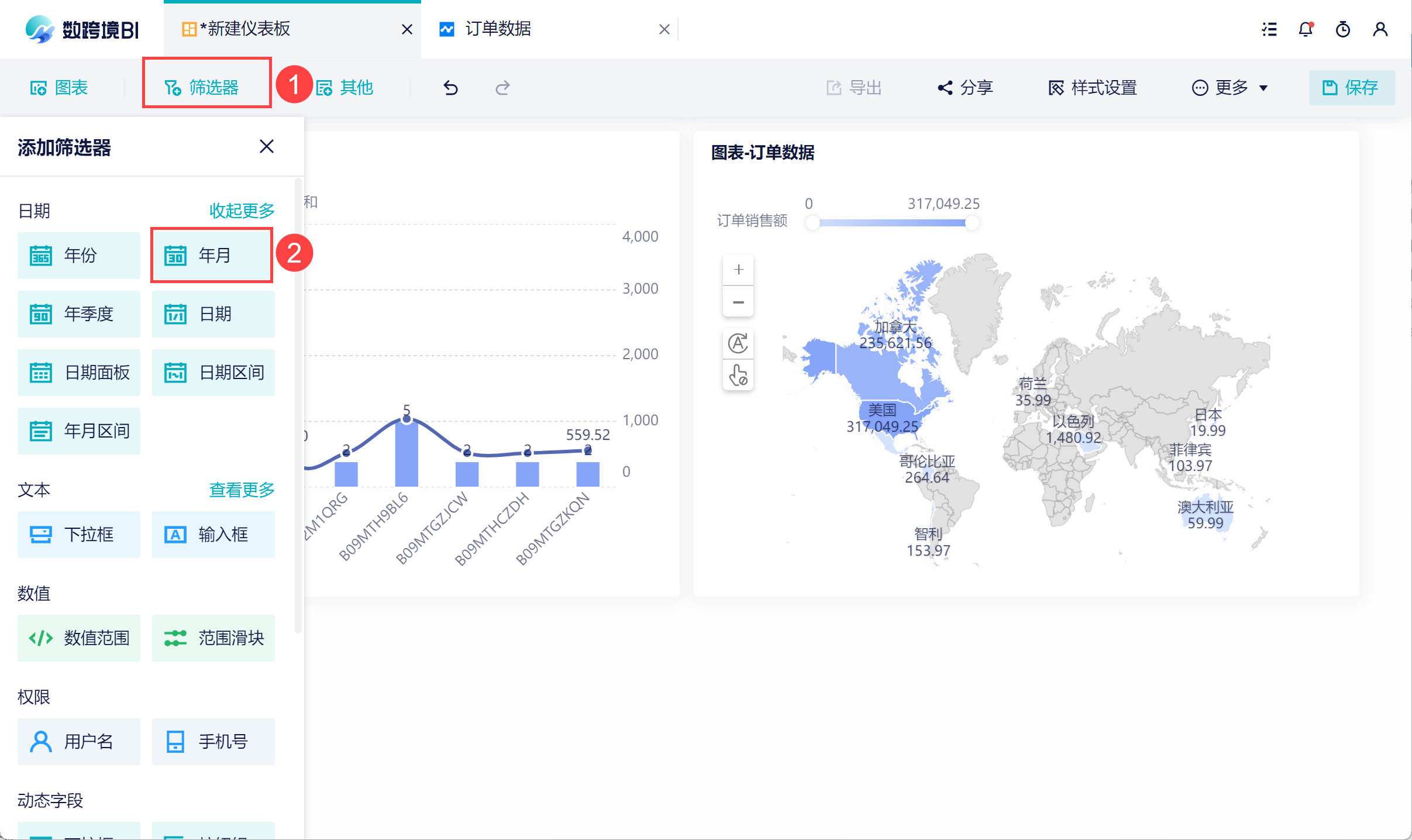 1)点击「+筛选器」,在列表中选择「年月」筛选器并拖入仪表板中。如下图所示: