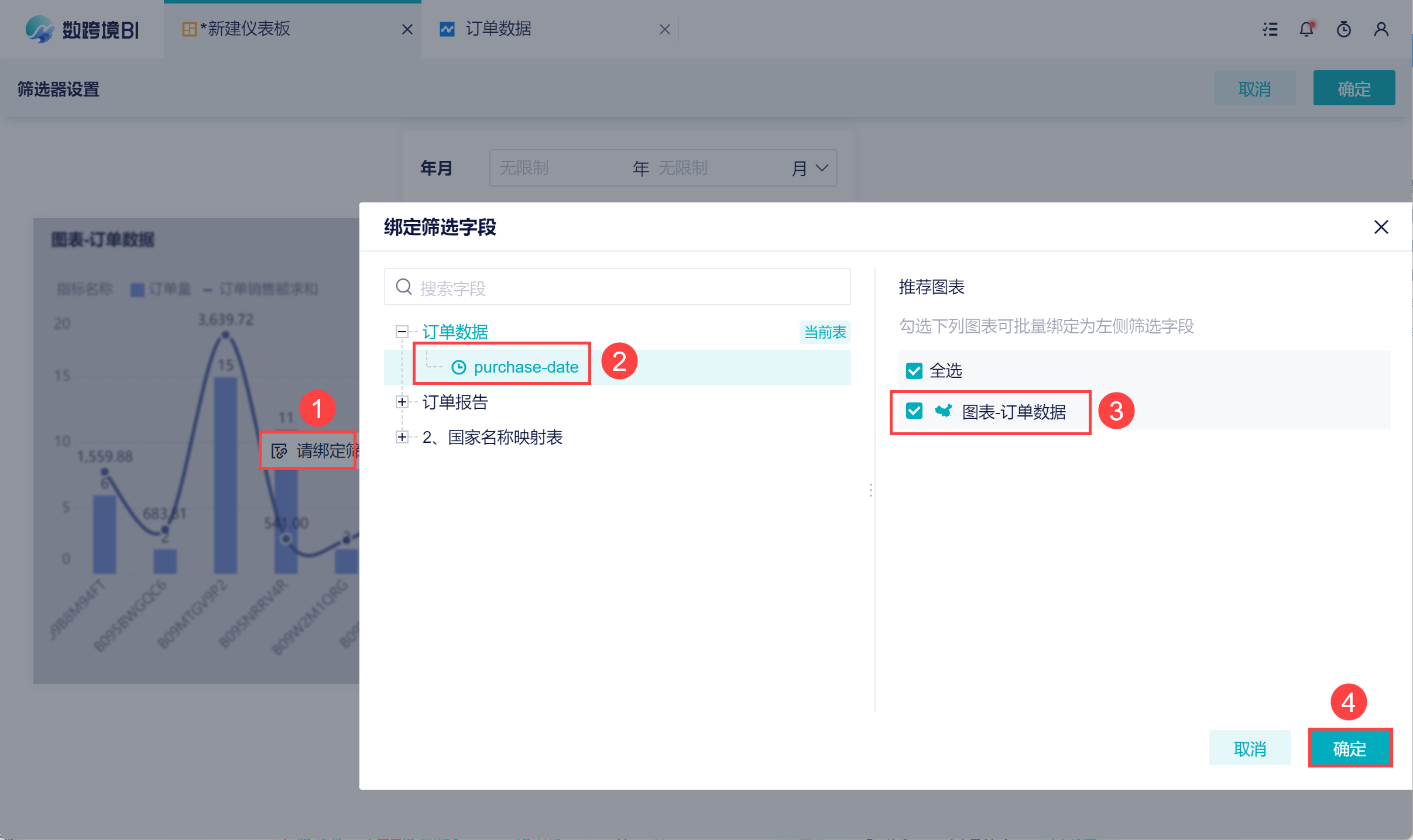 2)绑定分析表的「purchase-date」字段,在弹窗右侧,展示了当前字段可以绑定的其他图表。这样一个筛选器就可以绑定多张图表。勾选好图表后,点击「确定」。如下图所示: