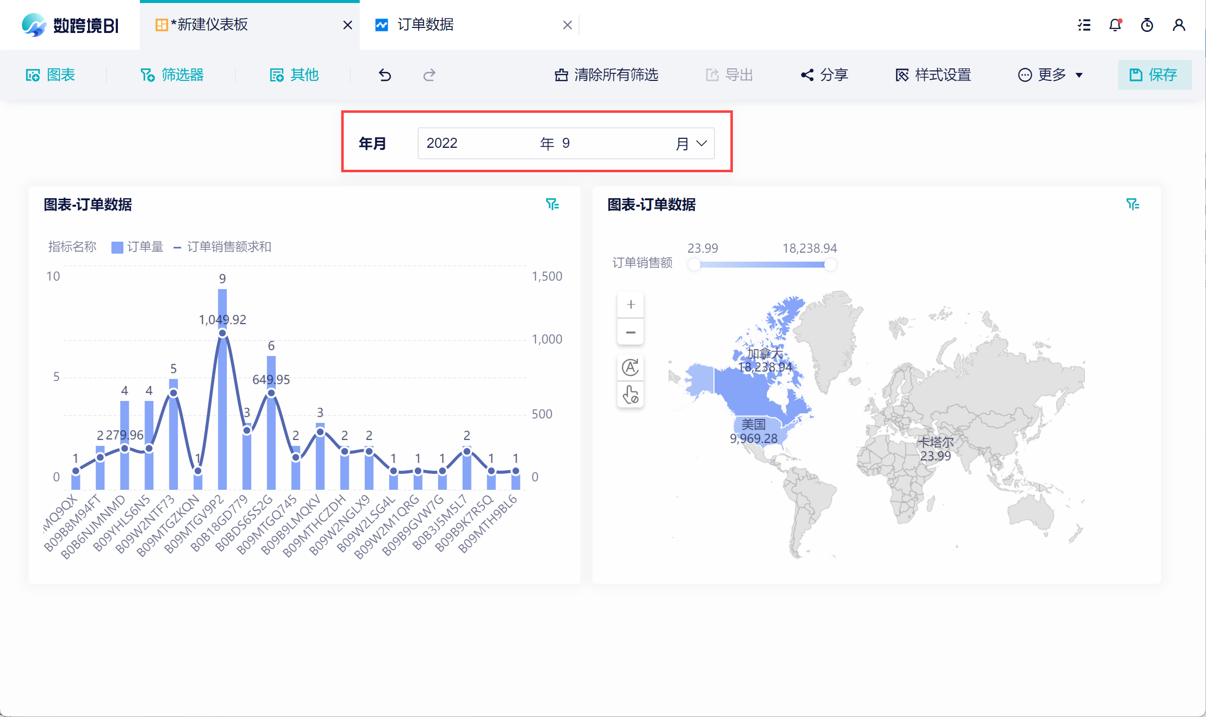 在仪表板中,可以添加筛选器,自由的设置筛选条件,查看多种信息。比如查看不同月份的数据情况。