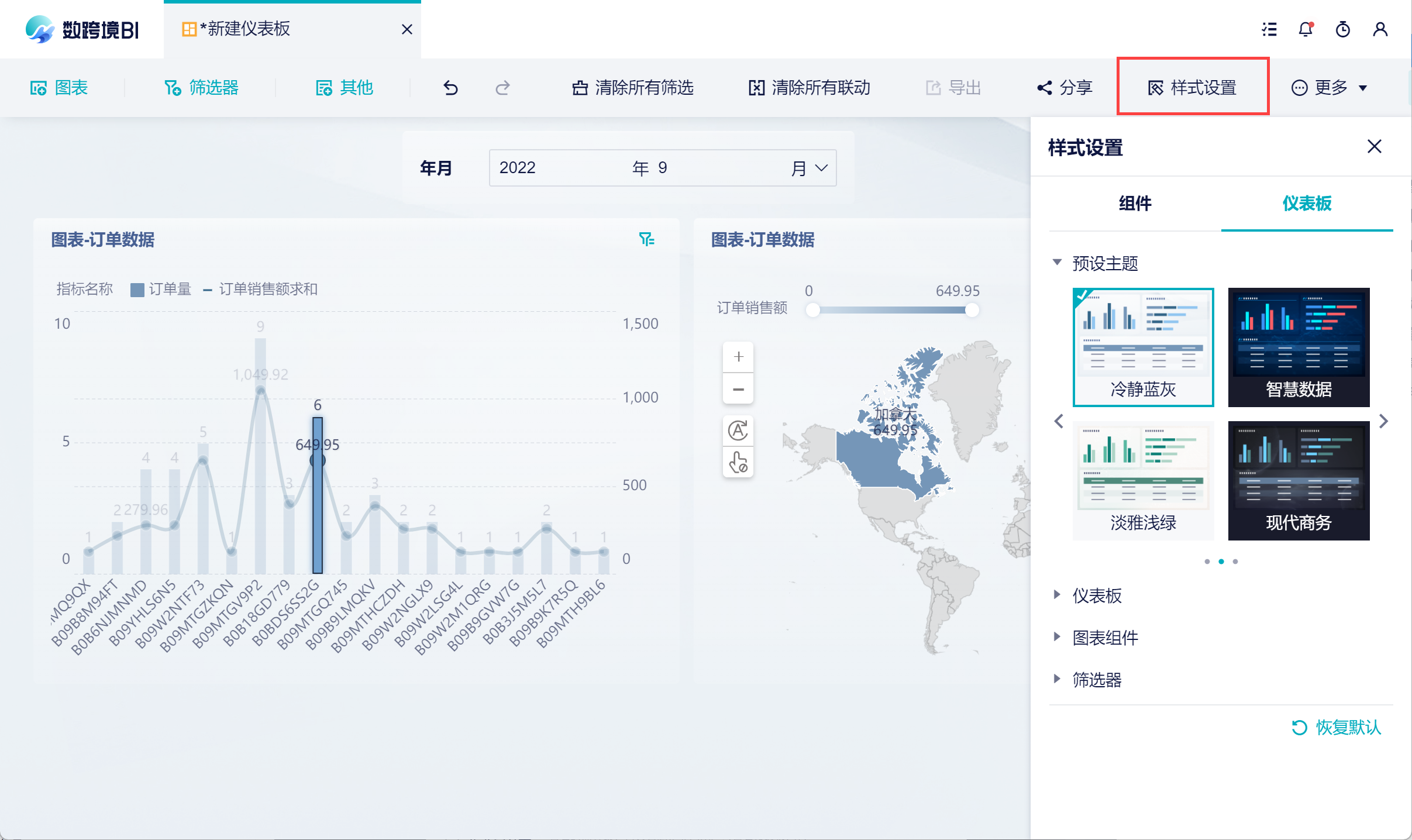 点击「样式设置」,可以对仪表板或者图表进行样式设置,比如设置主题颜色等等,大家可以自定义设置。如下图所示: