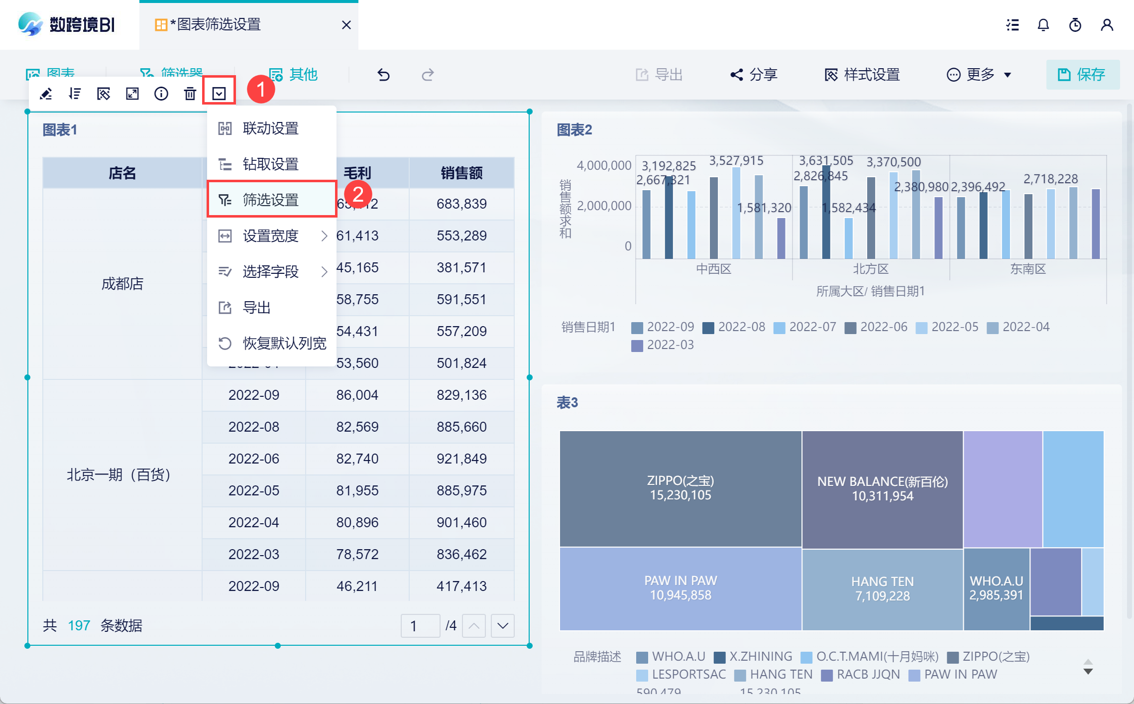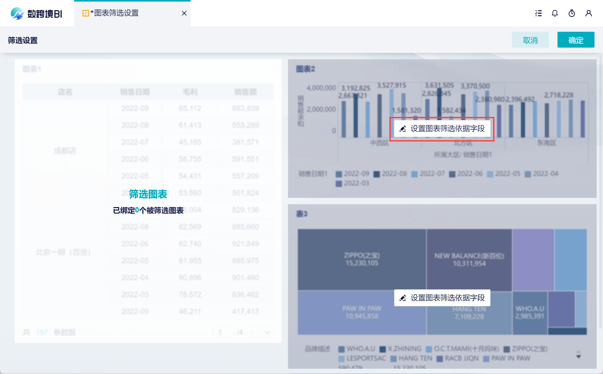 2)配置了图表1 作为筛选图表,点击图表 1 中「销售日期」的字段值,在图表 2 中将筛选并展示字段值的数据。