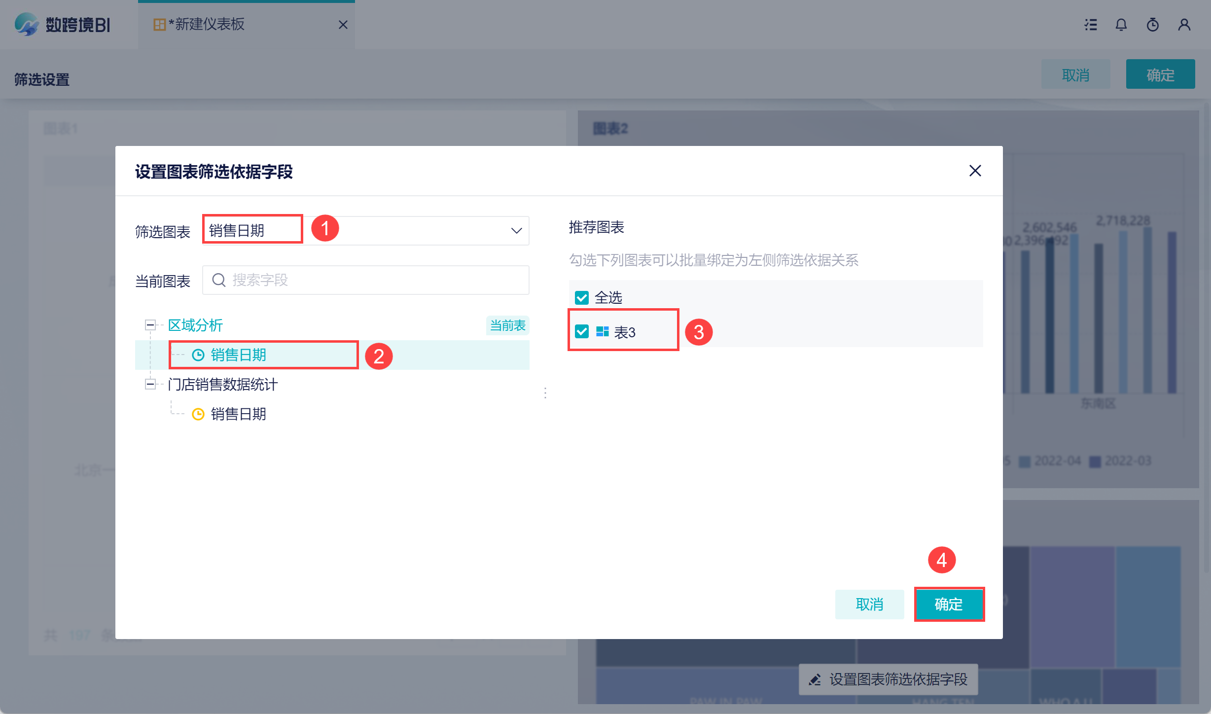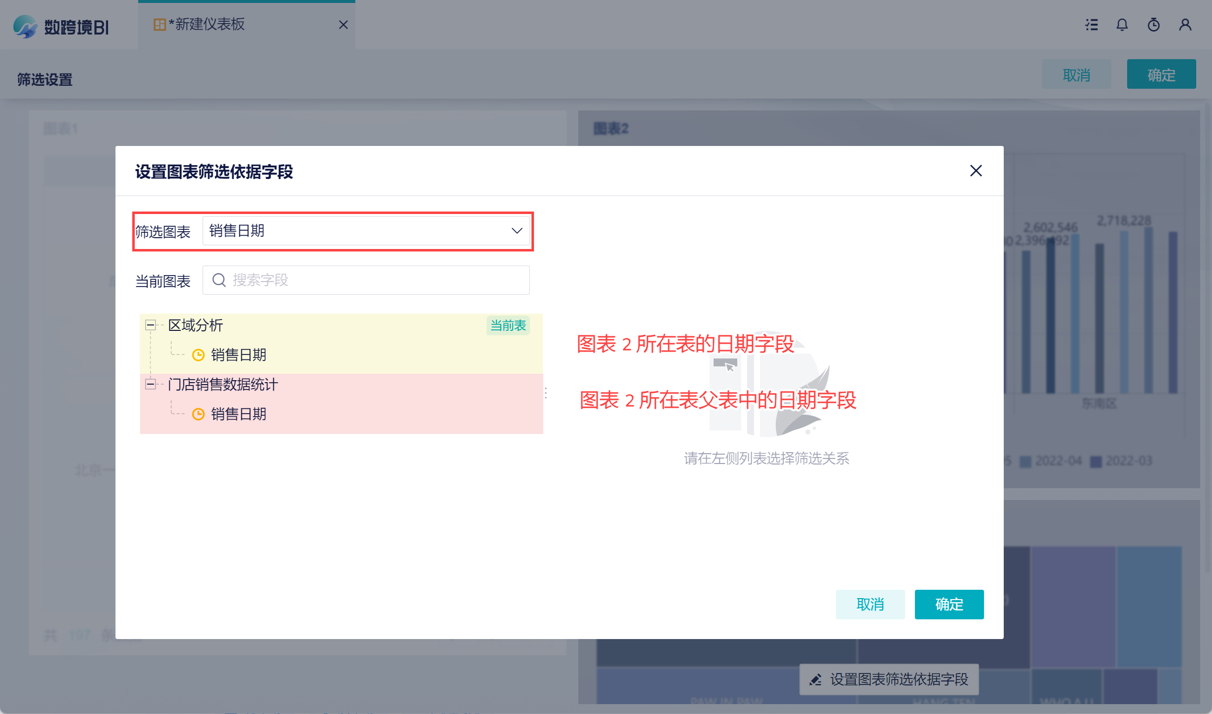 3)要实现 1.3 节日期值的传递,选择筛选图表中的「销售日期」字段,在下方会展示图表2所在表及其父表中的日期字段。如下图所示: