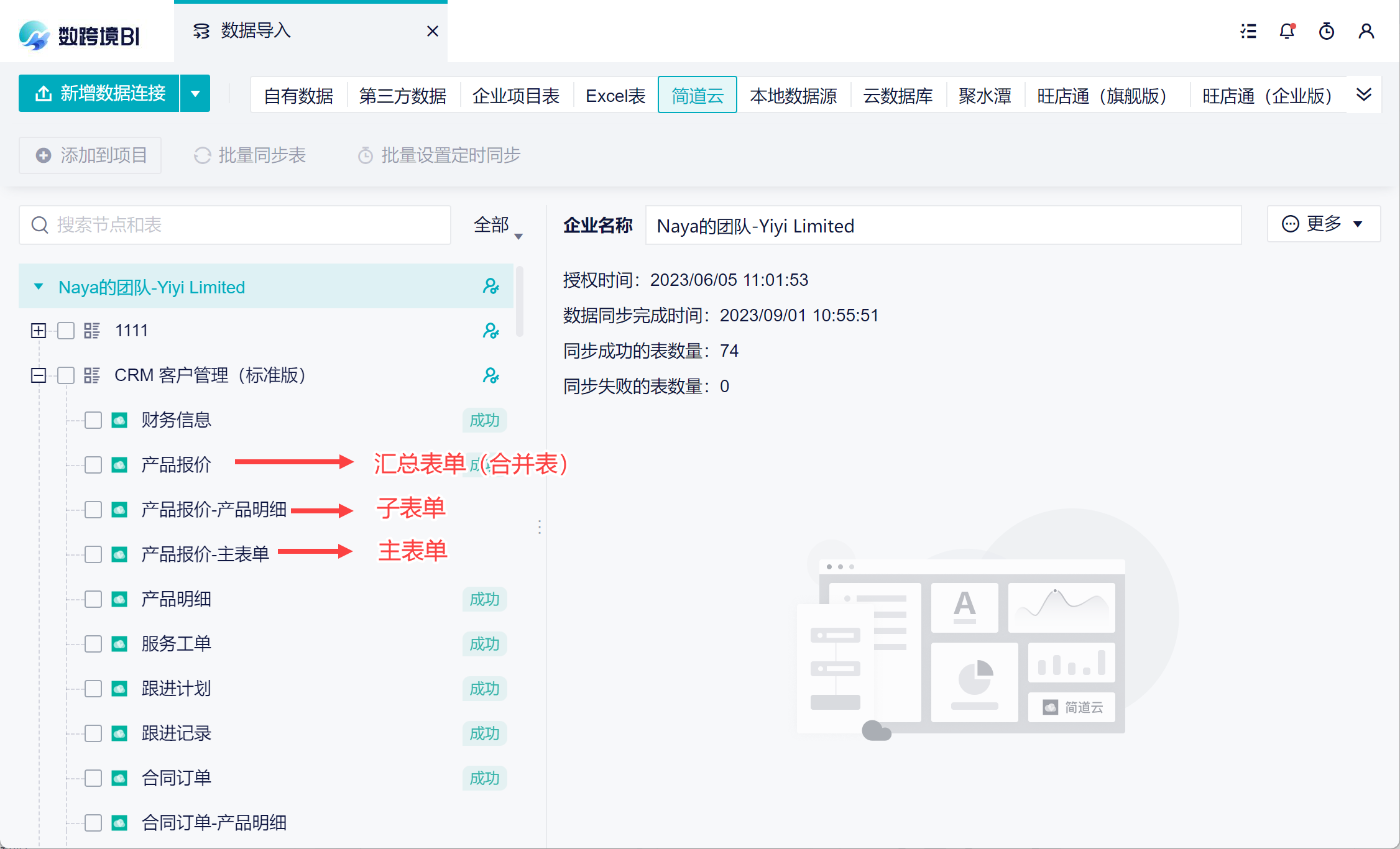 数据同步至九数云后是可以单独拆出子表单数据,可以将子表单数据添加到项目后进行分析。如下图所示:
