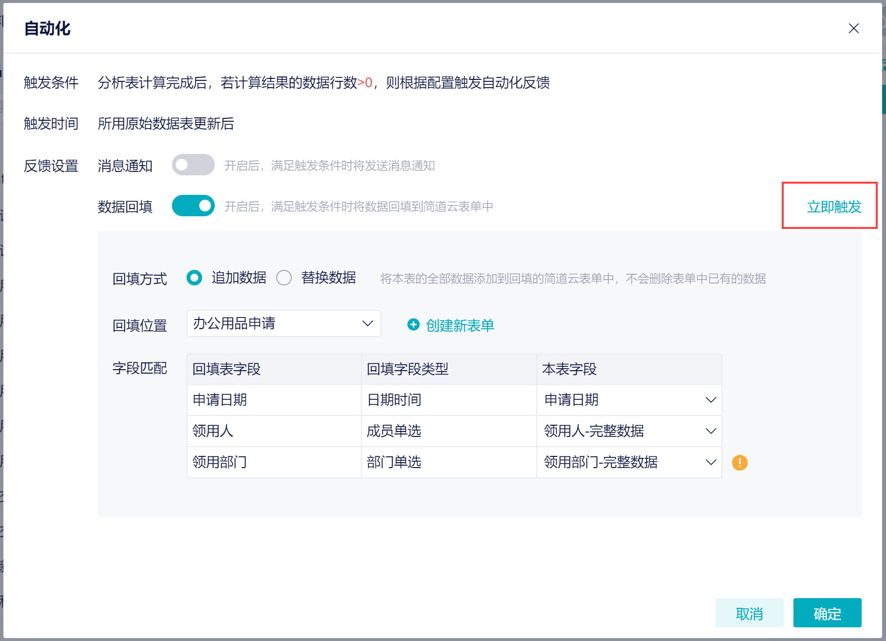 该数据表第一次设置回填,需要点击一下「立即触发」的按钮,如下次所示: