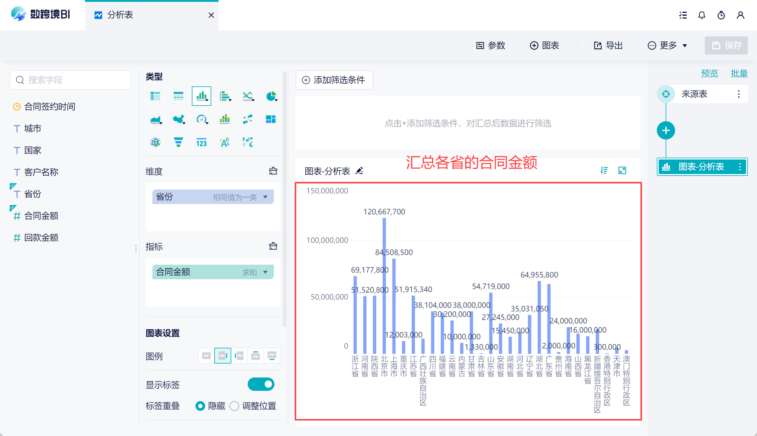 1)以柱形图为例,将「省份」、「合同金额」拖入字段框,可以汇总出各省的合同金额。如下图所示: