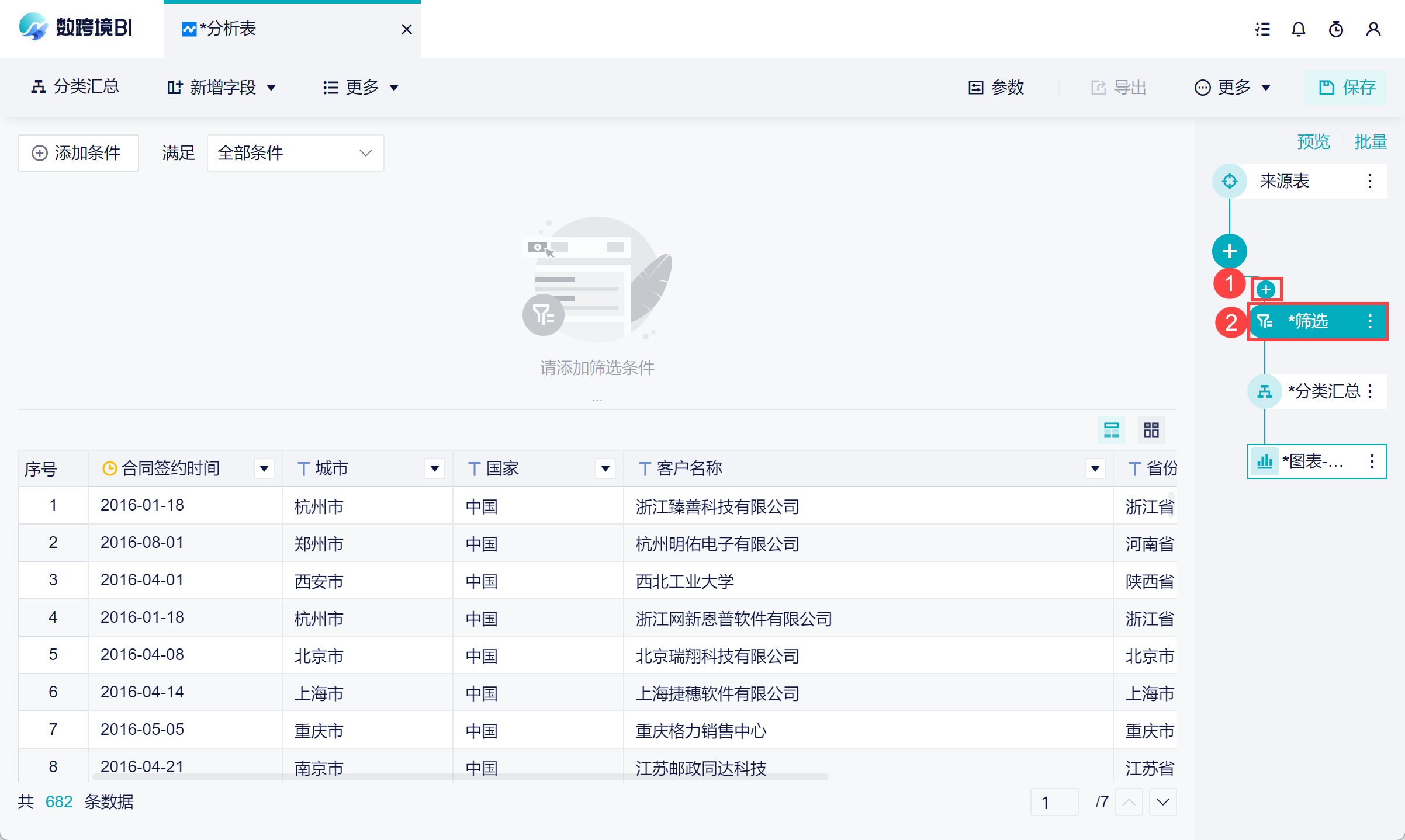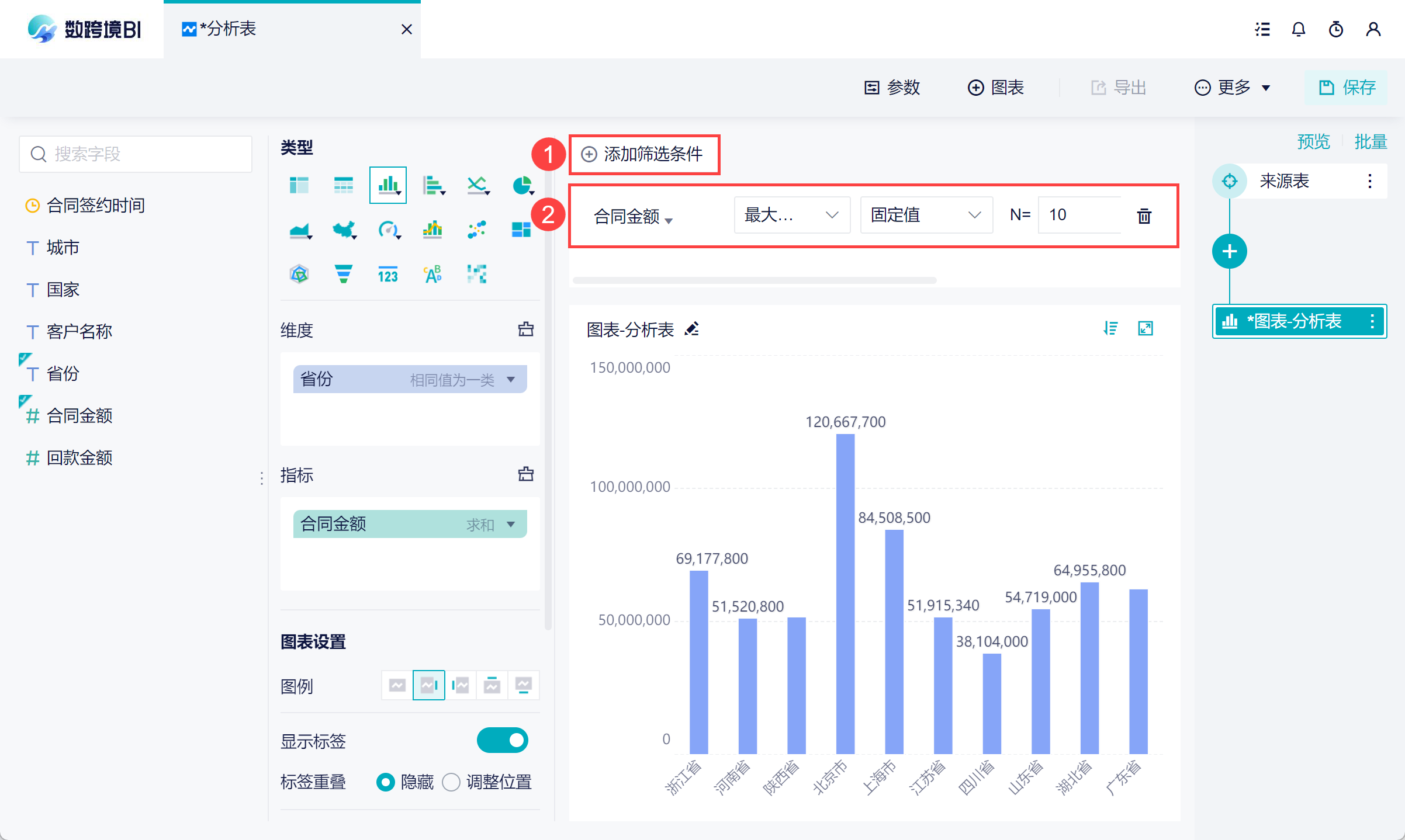 2)点击「添加筛选条件」,可以 对当前图表中已使用的字段进行设置,比如筛选出「合同金额」最大的 10 个。如下图所示: